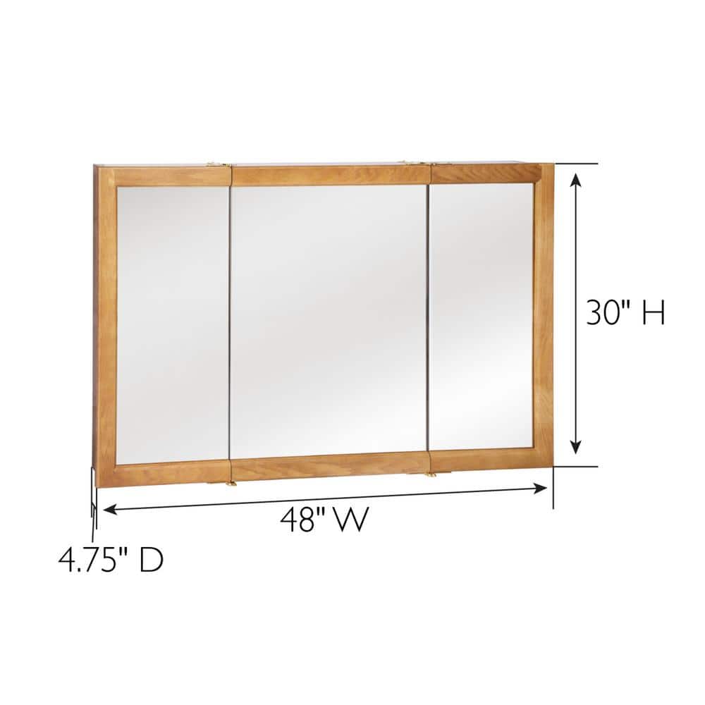 Elevate bathroom organization with the Design House Richland Surface-Mount Tri-View Medicine Cabinet. This elegant cabinet features three mirrored doors with a robust solid wood frame in a stunning nutmeg oak finish. Pre-assembled and equipped with two fixed shelves, it offers the perfect solution for storing your essentials while adding style to your bathroom.