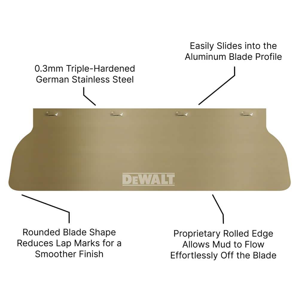 Upgrade your drywall finishing with the DEWALT 10 in. Replacement Skimming Blade Insert, crafted with precision-engineered European stainless steel. This insert enhances the performance of your skimming blade with a proprietary edge for a smoother finish, making it an essential tool for achieving professional-level results.