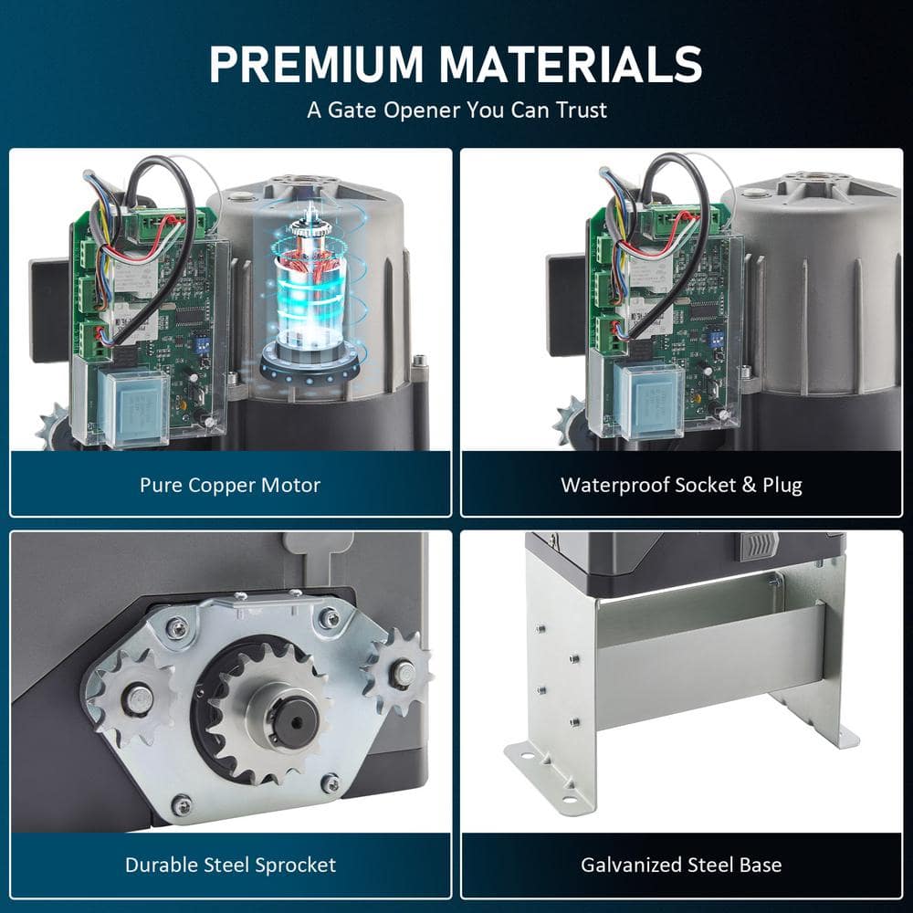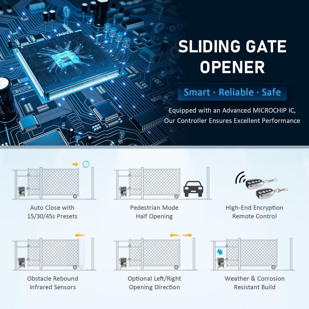 Experience ultimate security and convenience with the DOORADO Automatic Sliding Gate Opener, perfect for gates up to 4400 lb and 20 ft in length. Powered by a robust 750W all-copper motor, this opener kit offers safe, smooth operation at 42.5 ft per minute, complete with infrared sensors for added protection.