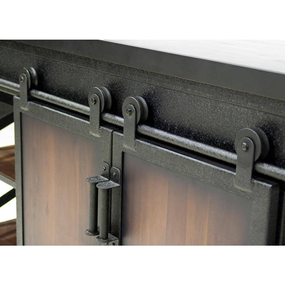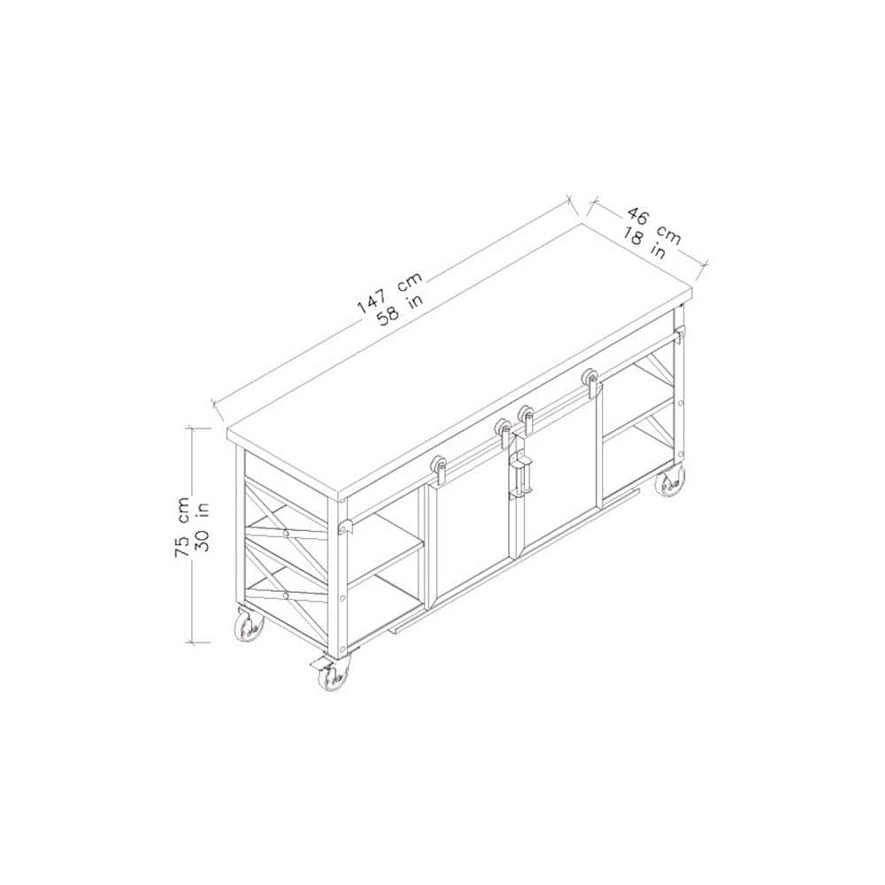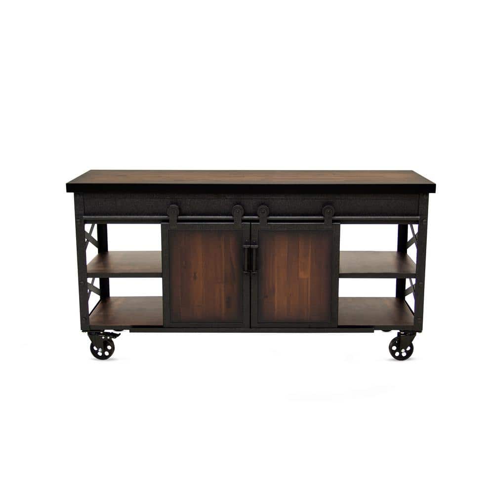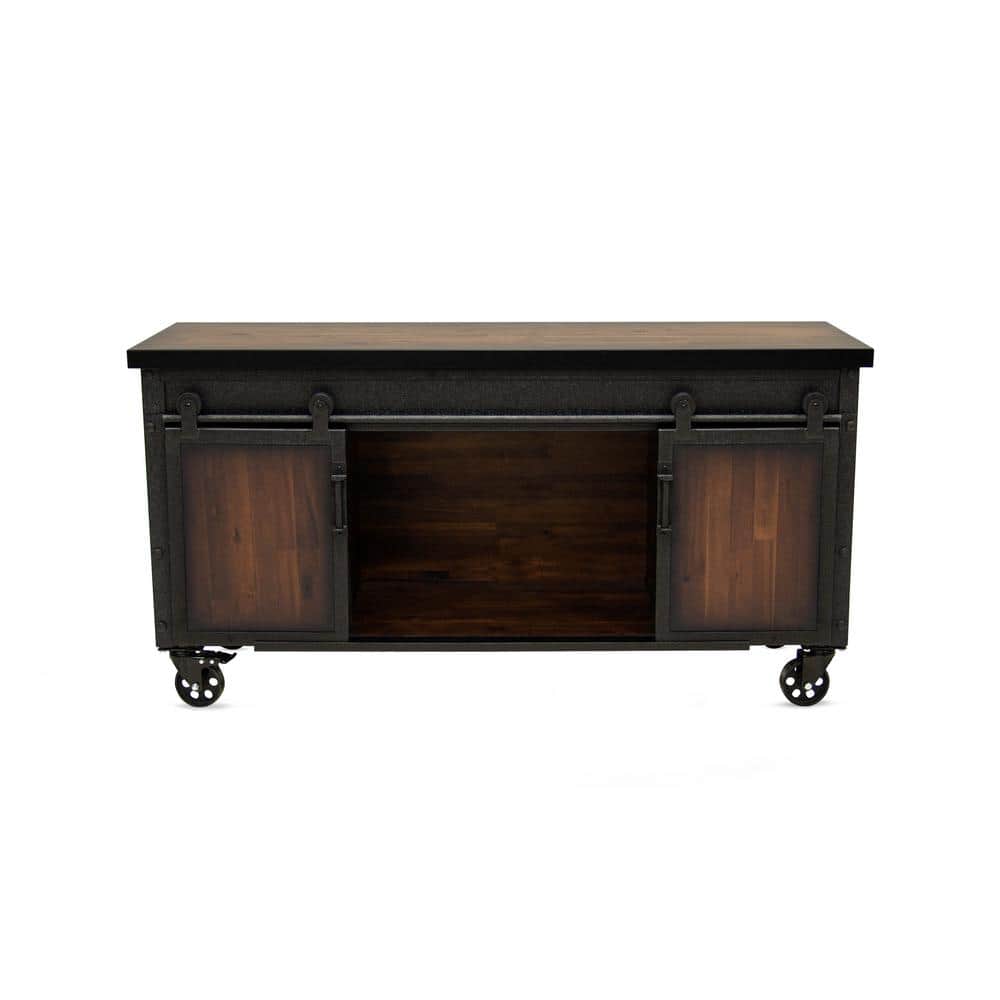 The DURAMAX 58 in. Farmhouse Bottom Cabinet marries rugged industrial style with multifunctional use. Featuring a blend of metal and wood, this cabinet is perfect for any decor and offers smooth rolling doors and locking wheels, making it a versatile addition to your space.