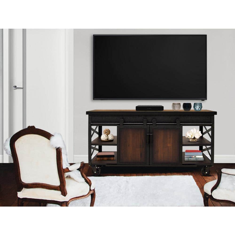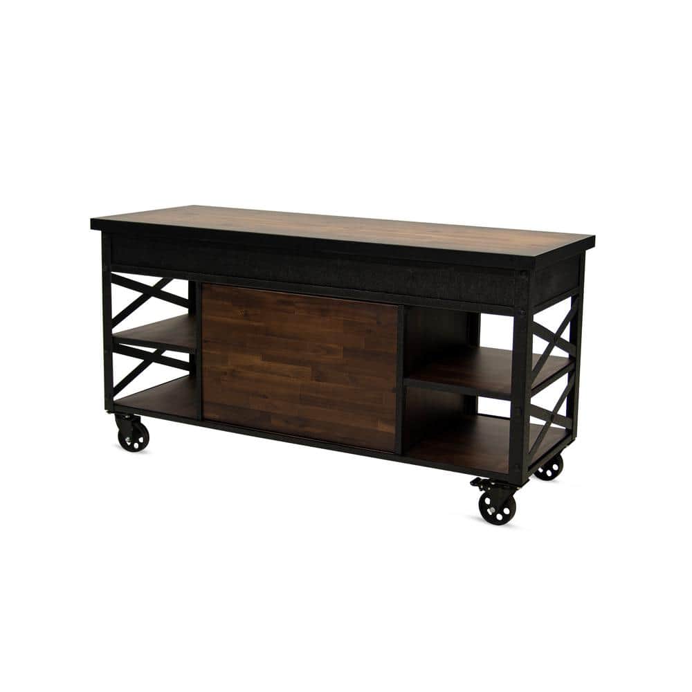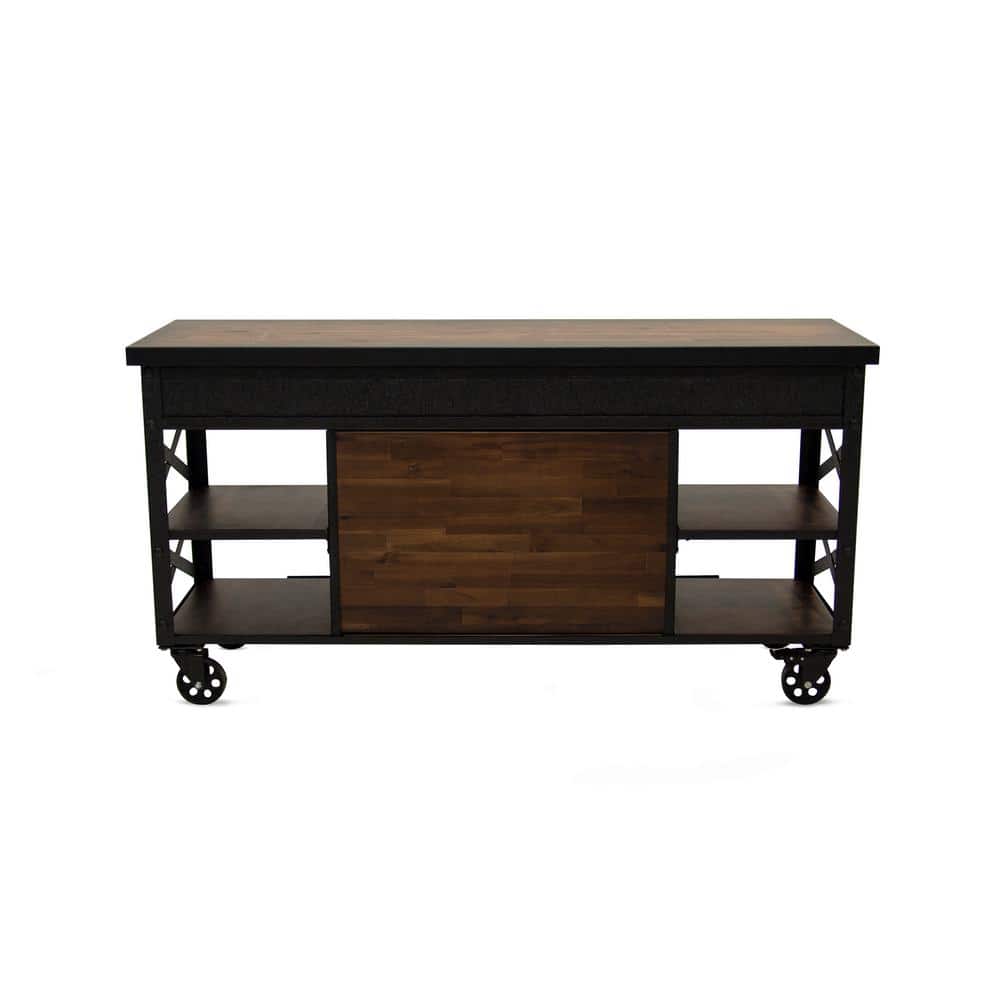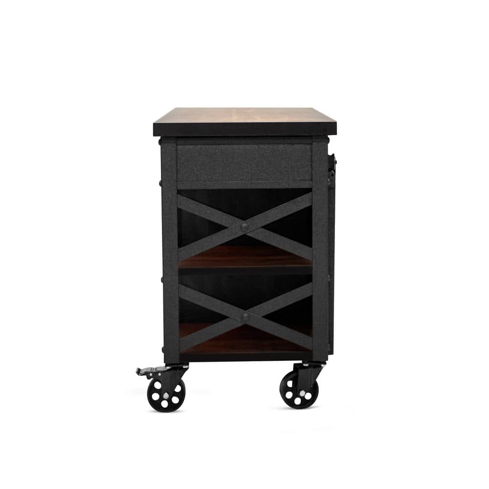 The DURAMAX 58 in. Farmhouse Bottom Cabinet marries rugged industrial style with multifunctional use. Featuring a blend of metal and wood, this cabinet is perfect for any decor and offers smooth rolling doors and locking wheels, making it a versatile addition to your space.