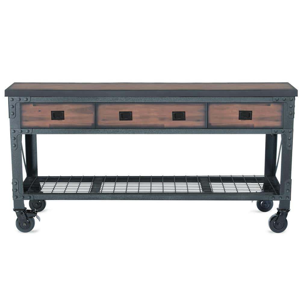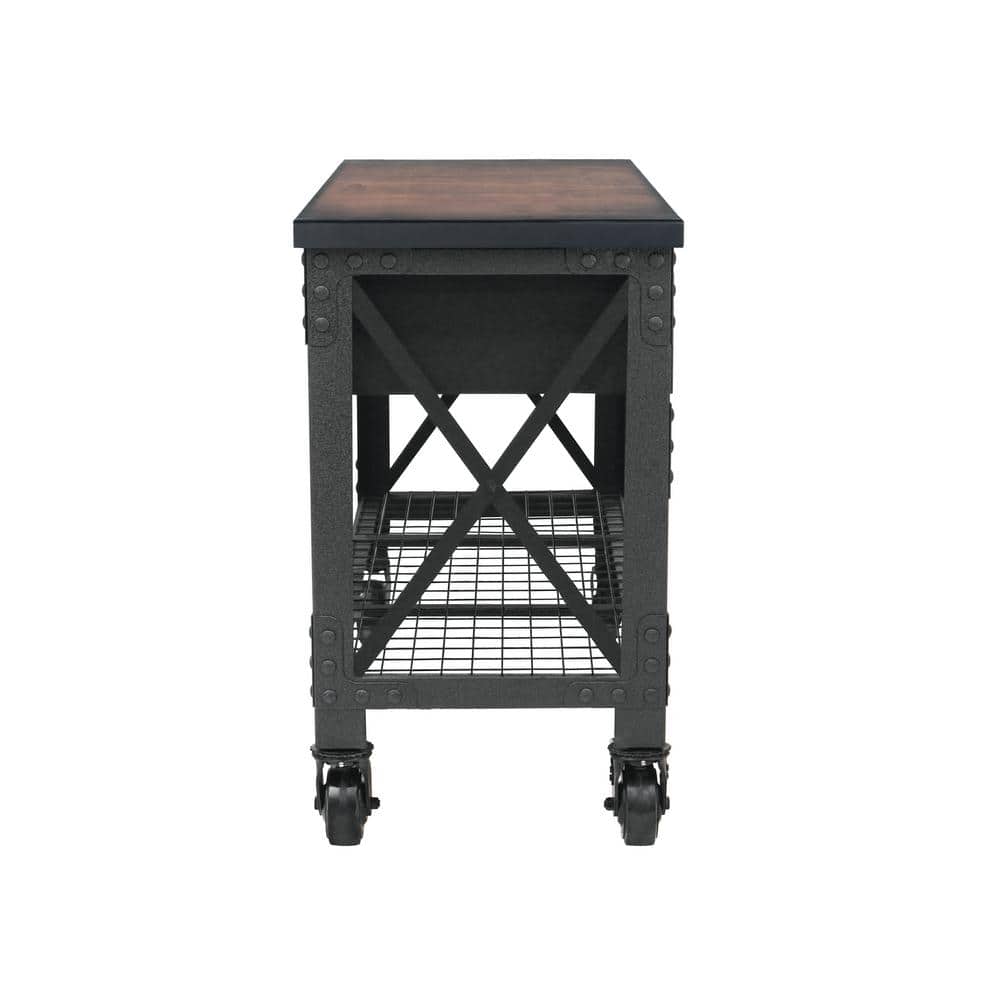 Transform your workspace with this striking mobile workbench, where form meets unparalleled functionality. The solid rubberwood top exudes timeless warmth, while its industrial steel frame adds a touch of rugged sophistication. Glide it effortlessly into your atelier to showcase as a statement piece, or use as an impromptu kitchen island for a modern industrial twist. This piece promises to be an indelible addition to any creative or functional space, merging practicality with sheer style.