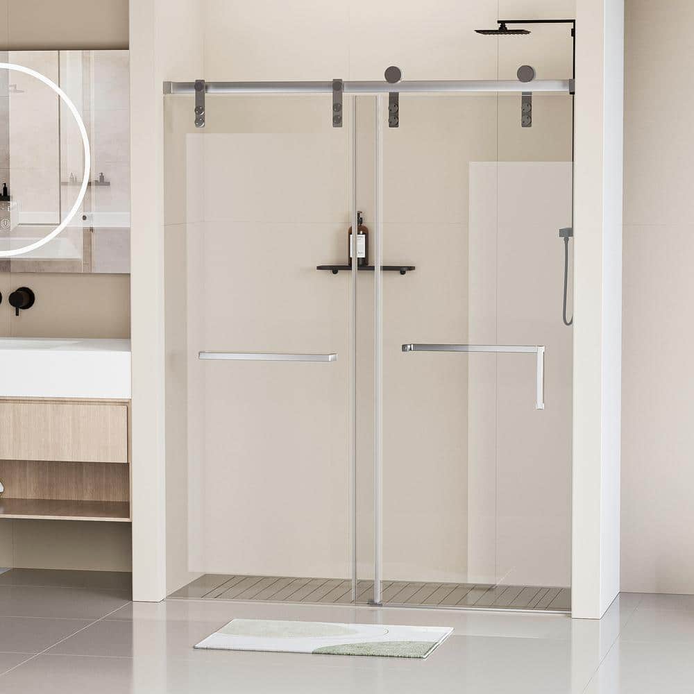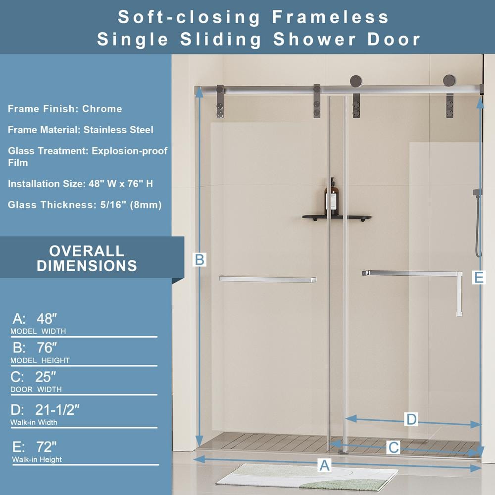 EAKYHOM 48 in. W x 76 in. H Soft Closing Single Sliding Frameless Shower Door in Chrome Finish w/ 5/16 in. Tempered Clear Glass