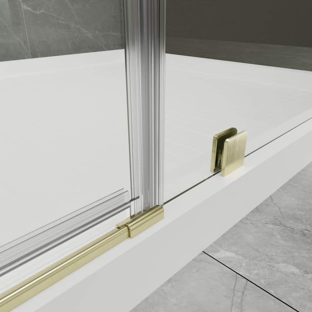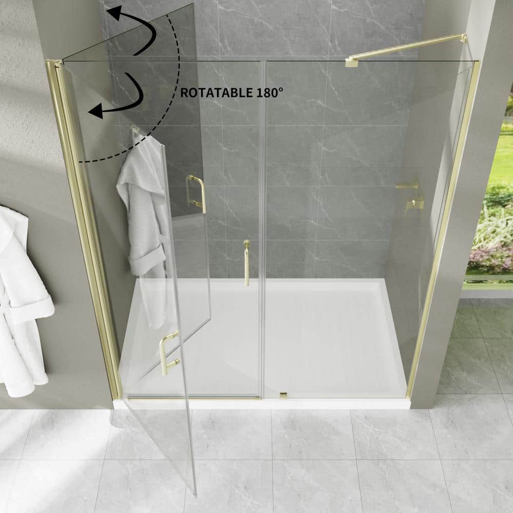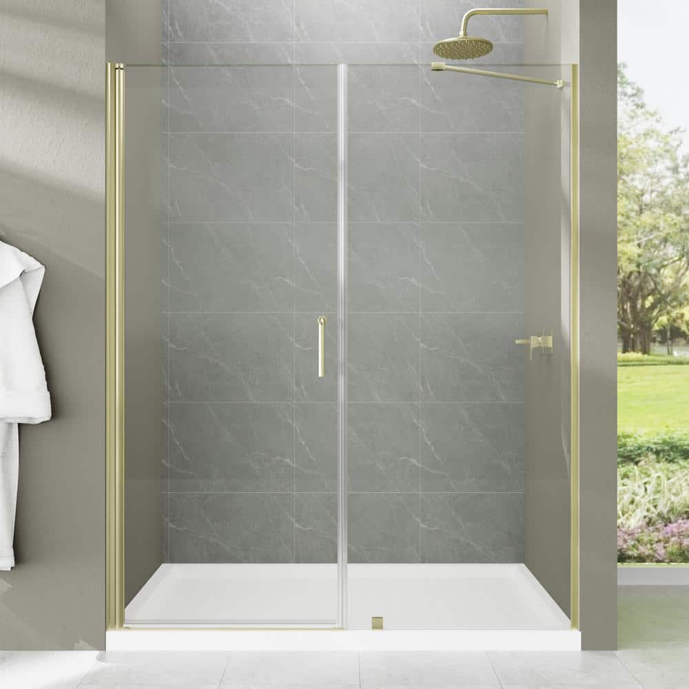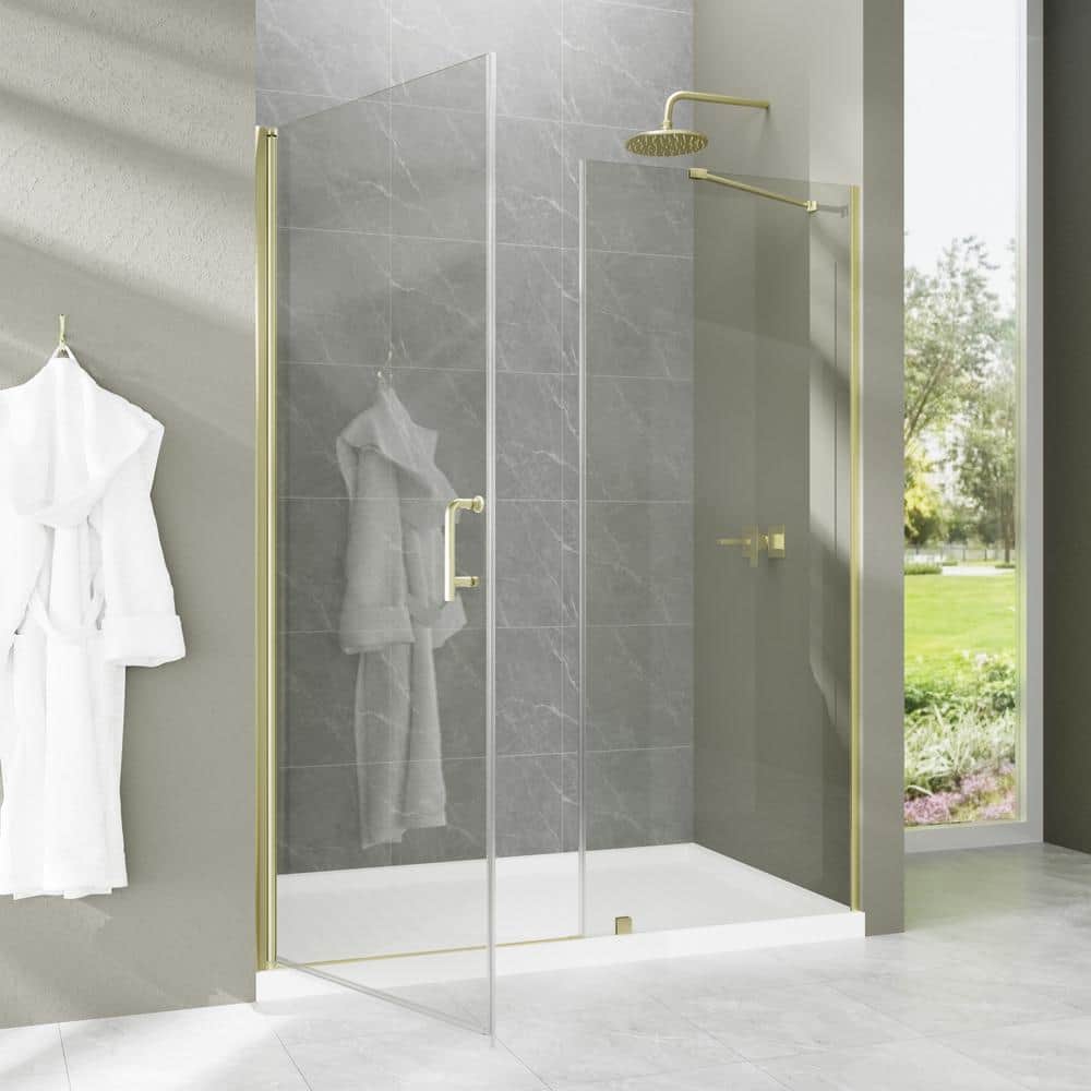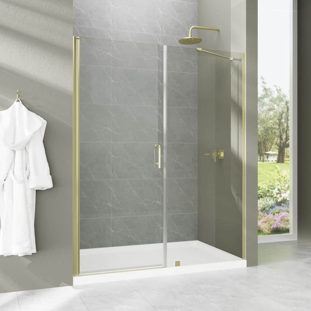 Experience modern elegance in your bathroom with EAKYHOM's 56-60 in. W x 72 in. H Pivot Semi-Frameless Shower Door. Featuring clear tempered glass and a brushed gold finish, this shower door combines style and practicality for a sleek and spacious look. Its pivot mechanism and adjustable fit make it versatile for various bathroom configurations.