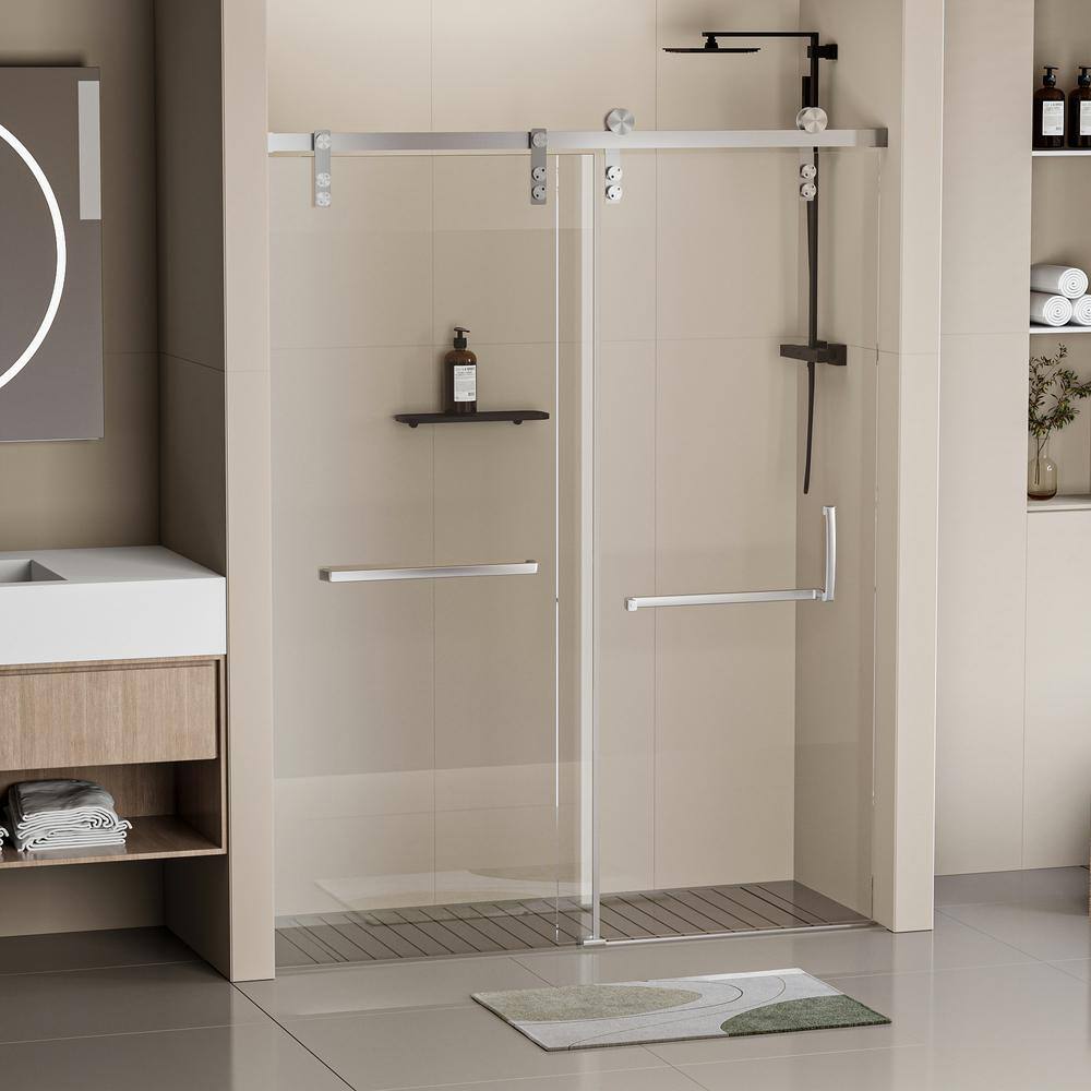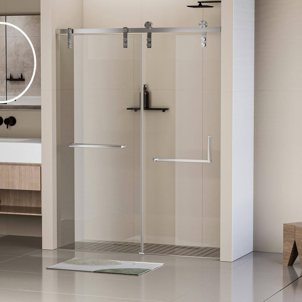 • Sleek Design: Frameless sliding door with a brushed nickel finish enhances any bathroom style with a modern touch.