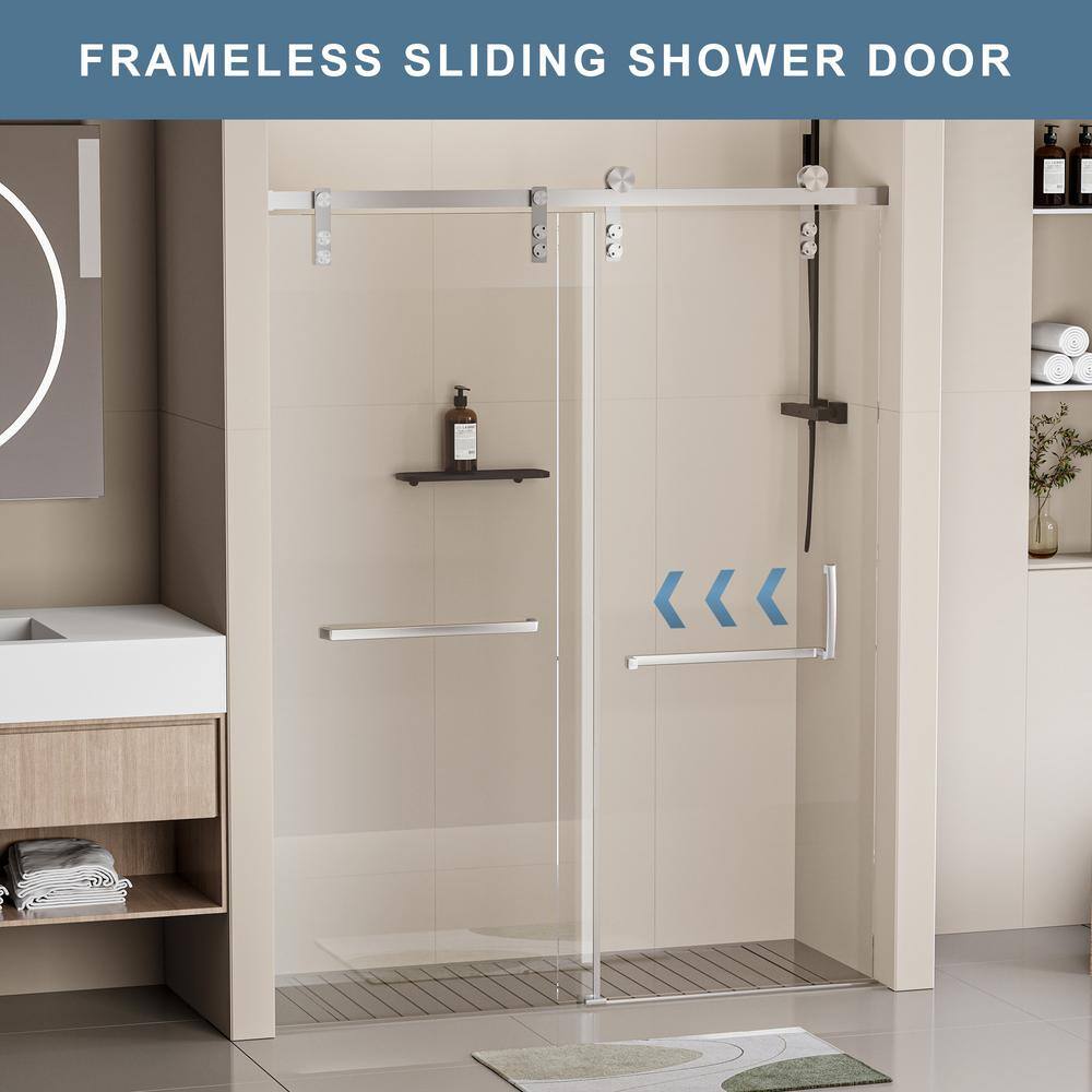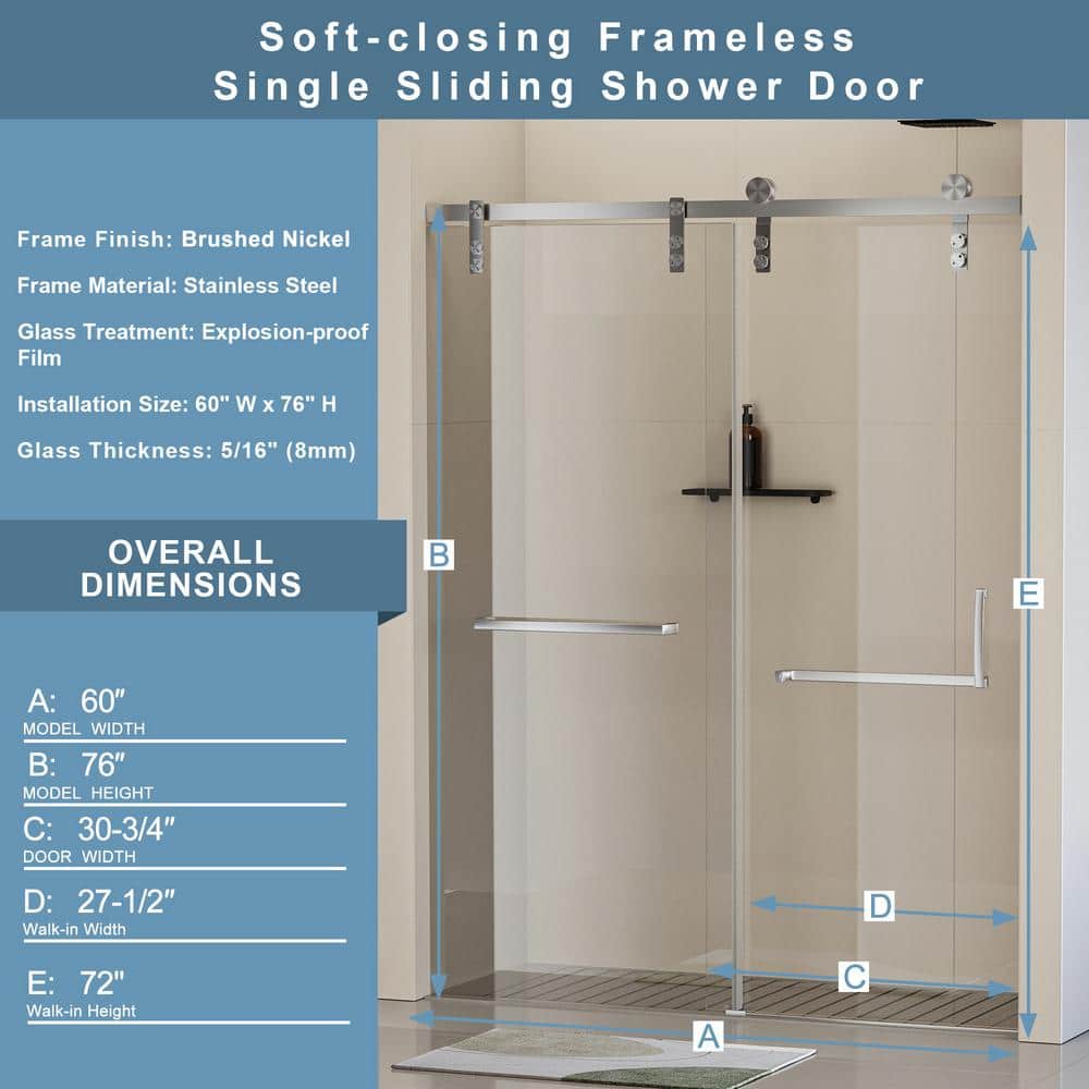 EAKYHOM 60 in. W x 76 in. H Soft Closing Single Sliding Frameless Shower Door in Brushed Nickel Finish with 5/16" Tempered Glass