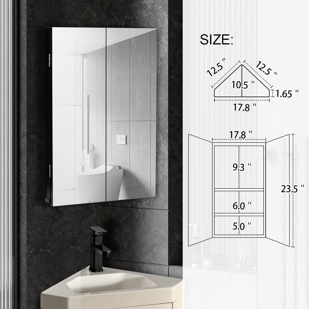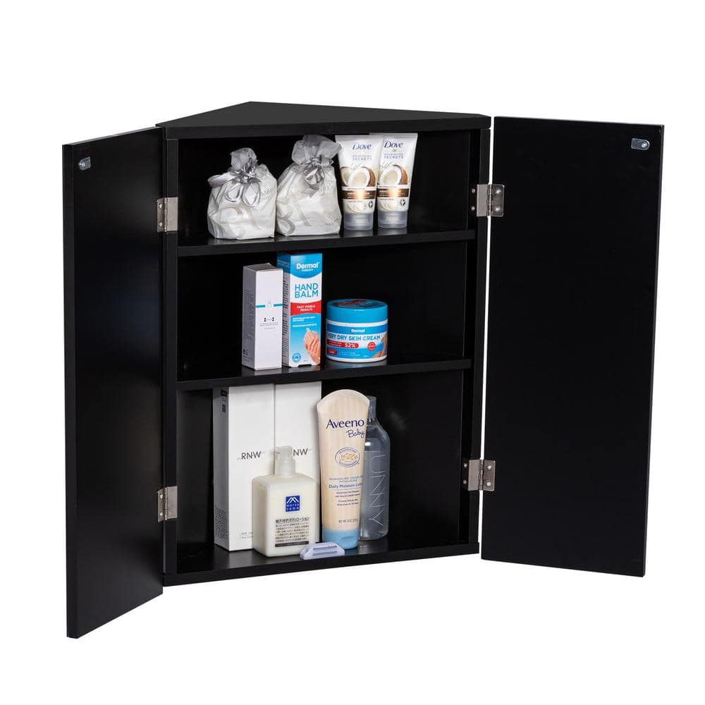 Elevate your bathroom's functionality with the eclife Double Door Corner Medicine Cabinet. This frameless mirror cabinet offers ample storage with its three shelves, all wrapped in a sleek black finish. The strategic corner surface mount design makes it an ideal choice for maximizing space in smaller bathrooms without sacrificing style.