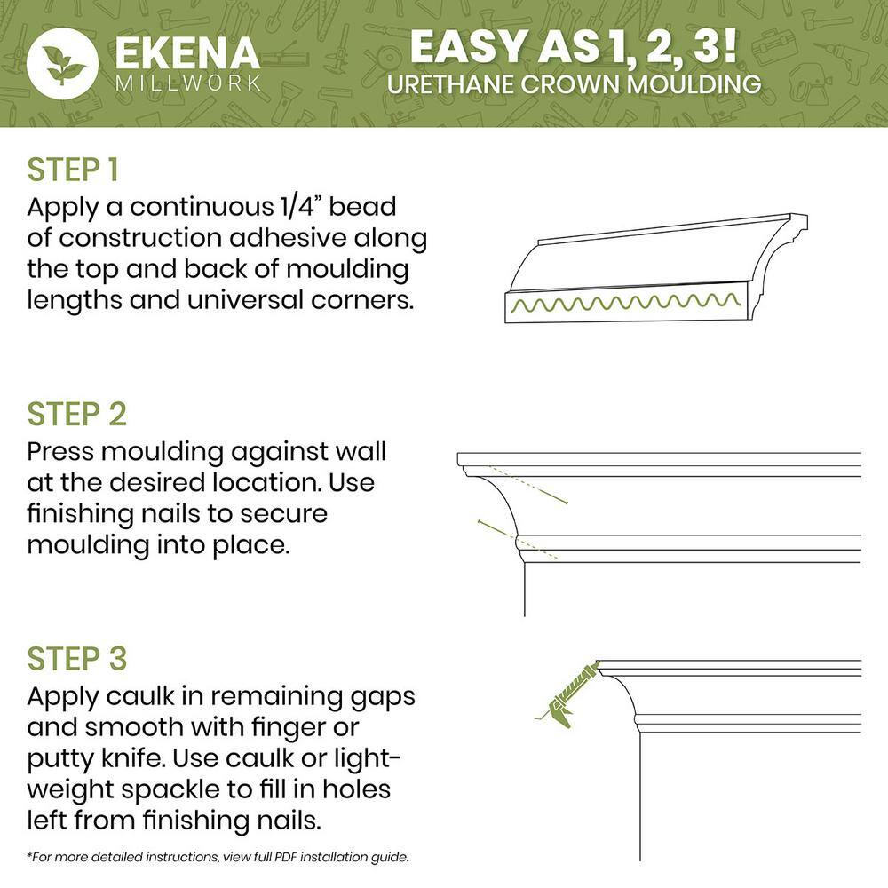 Enhance your room's aesthetics with the Chloe Polyurethane Crown Moulding from Ekena Millwork. This versatile moulding combines sharp design clarity with the practicality of solid urethane for durability and effortless maintenance. Transform spaces with easy installation and a distinguished look that complements both modern and traditional styles.