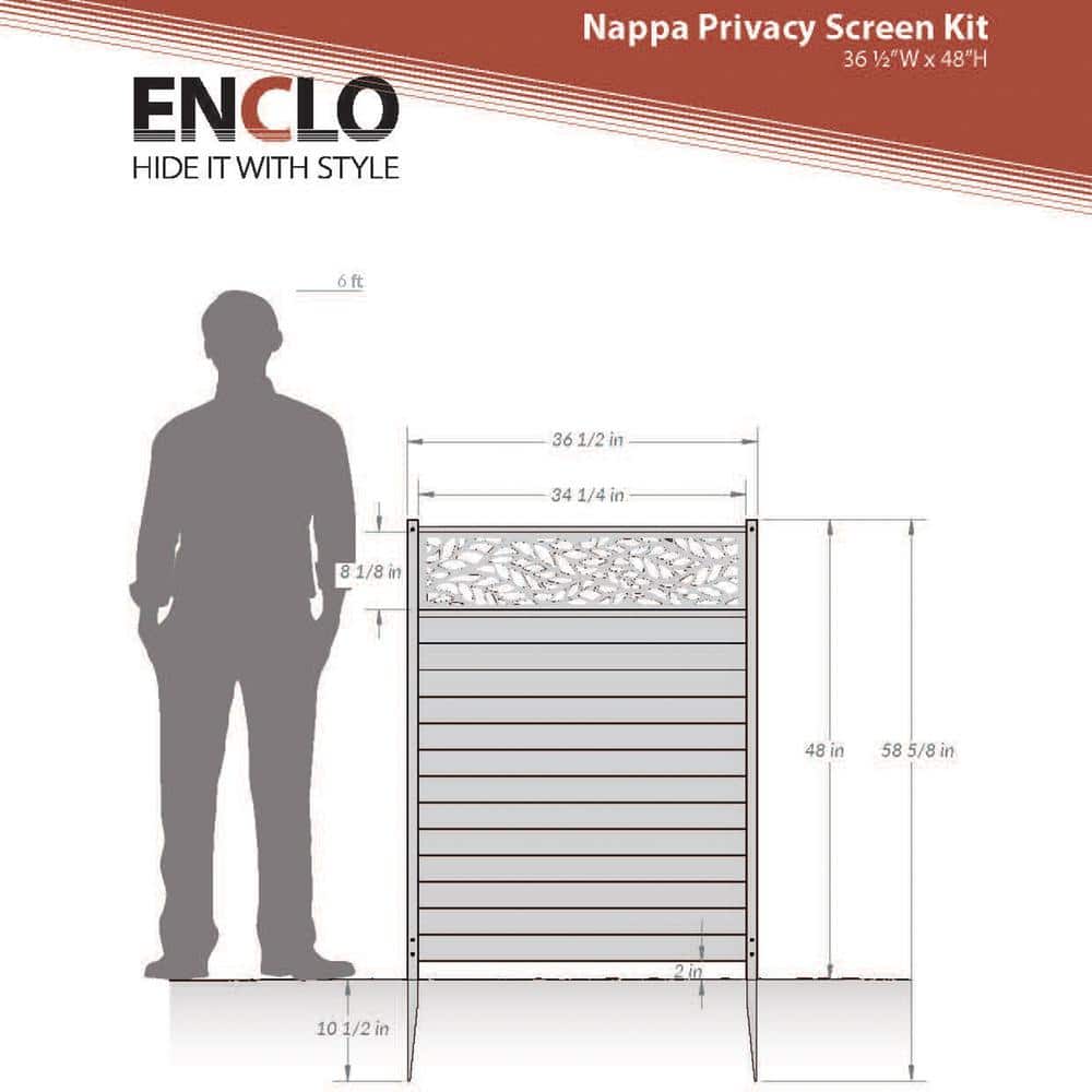 Transform your outdoor space with the Enclo Privacy Screens Nappa Lasercut WoodTek Vinyl Privacy Screen. Combining beauty and function, this 4 ft. x 3 ft. screen features a stunning laser cut design and full coverage paneling, perfect for hiding unsightly items while adding elegance to any yard.