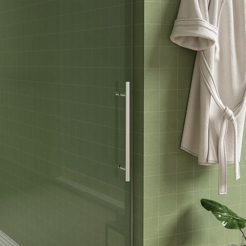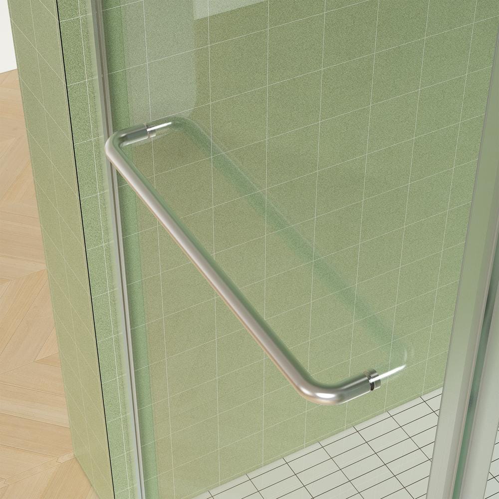 A: The shower door features a protective glass coating that repels water and stains, making it easier to wipe clean and maintain a pristine look.