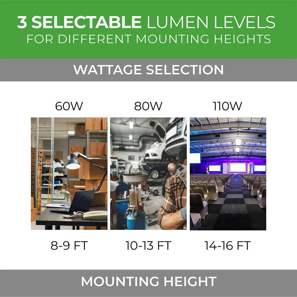 Efficient Design: Replaces traditional 250-Watt HID and fluorescent fixtures with adjustable wattage settings.