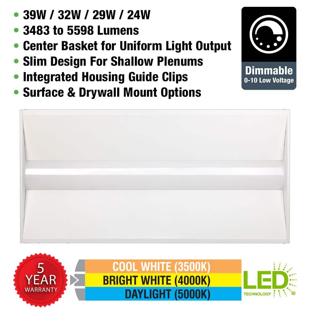 Illuminate your space with the ETI Lighting Center Basket LED Troffer. Featuring selectable color temperatures and wattages, this versatile troffer provides uniform, shadow-free lighting ideal for commercial environments. With an easy surface mount installation and dimmable technology, it's perfect for offices, schools, and more.