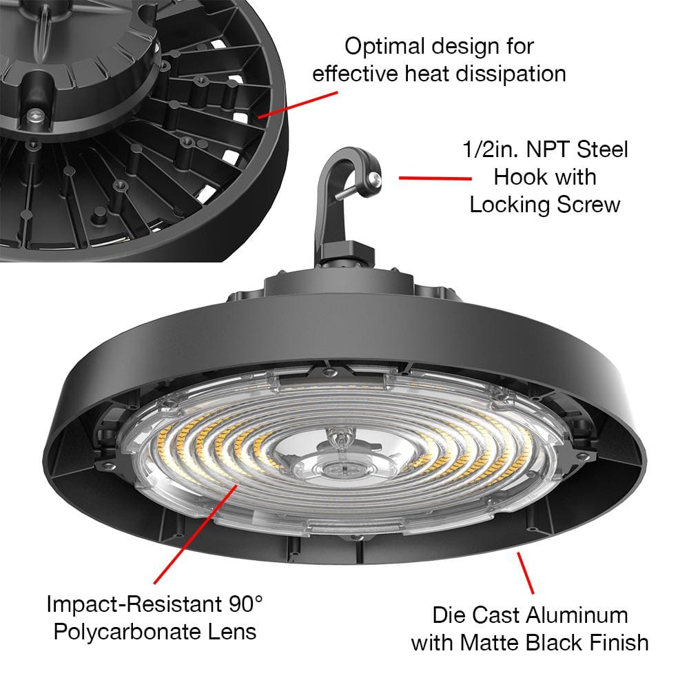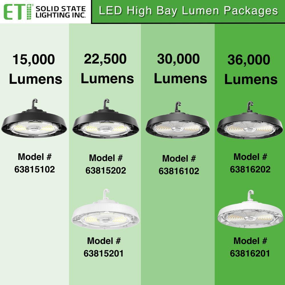 Transform commercial settings with ETI LIGHTING's 400-Watt Equivalent Round LED High Bay Light. Featuring adjustable wattage, versatile color temperatures, and robust aluminum construction, this high bay light set is perfect for warehouses, gyms, and industrial spaces.