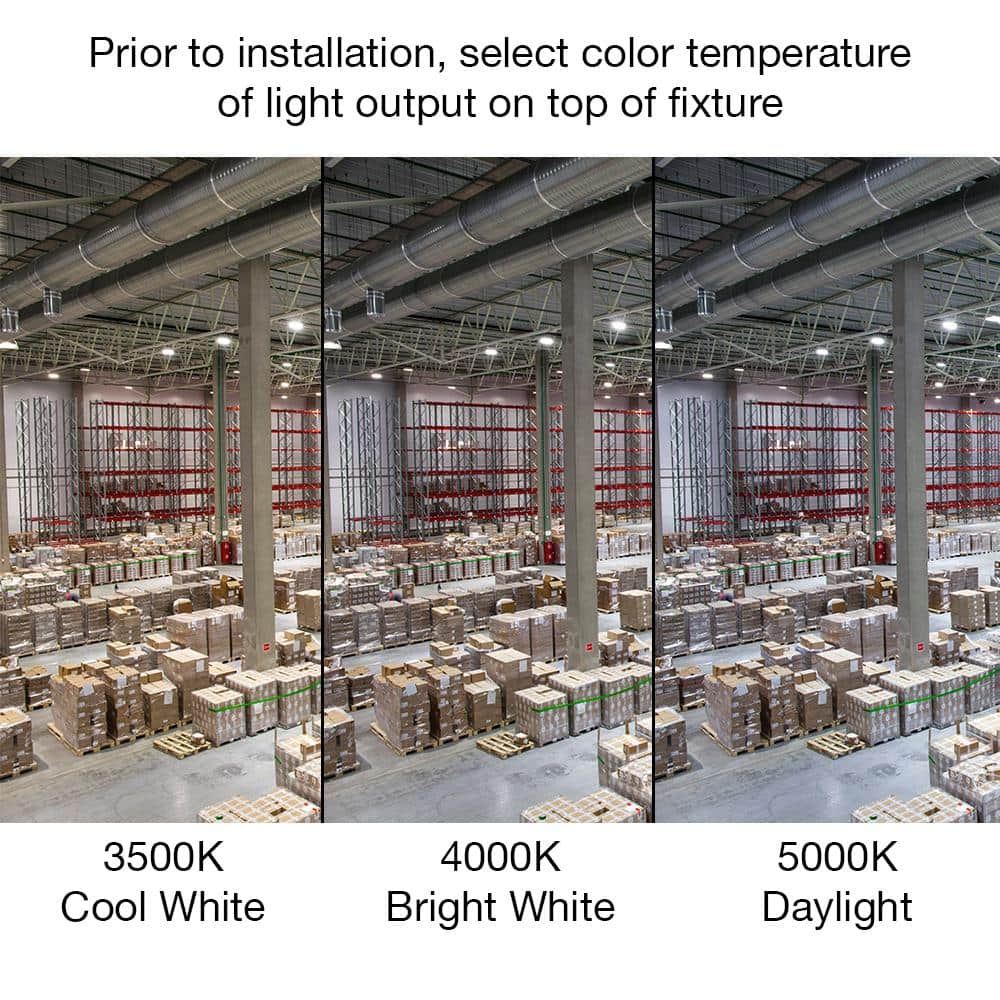 A: The high bay light features a selectable CCT switch allowing you to change between Cool White (3500K), Bright White (4000K), and Daylight (5000K) to best suit your lighting needs.