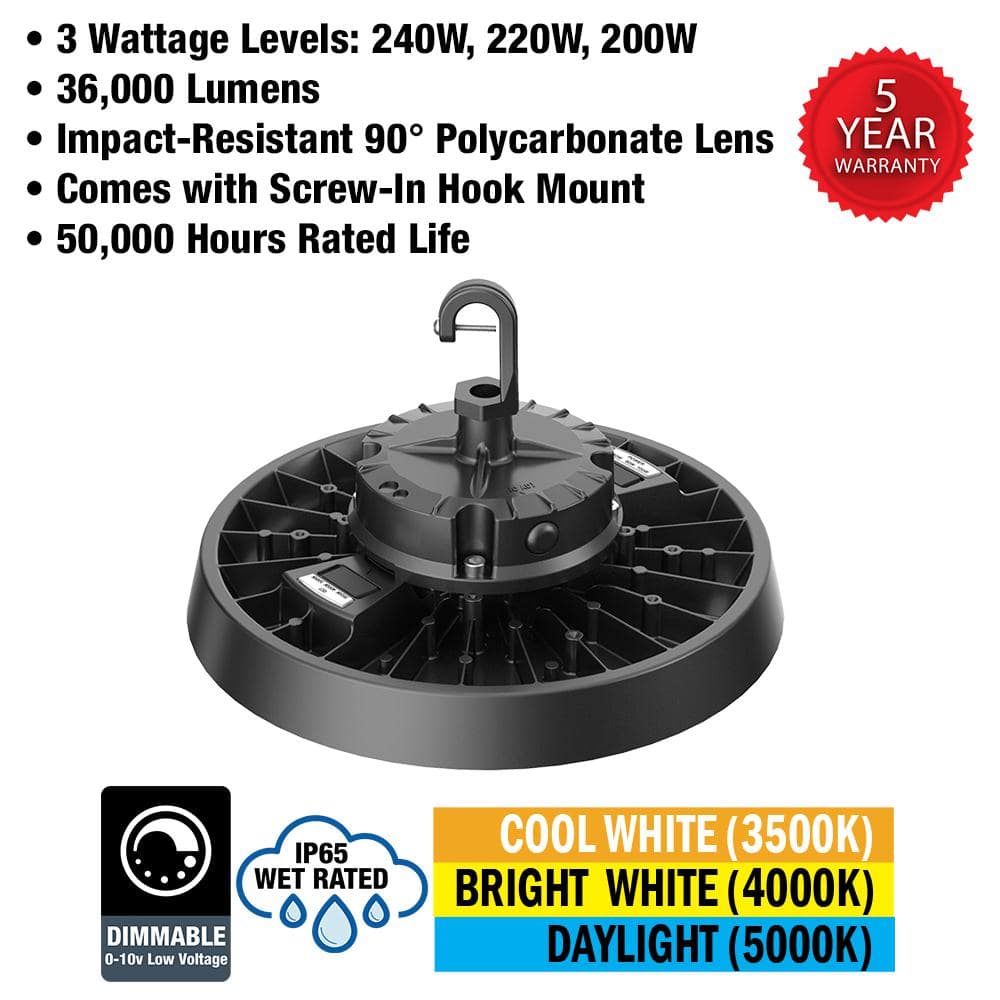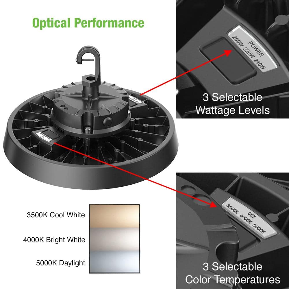 • Flexibility: Adjustable wattage levels (200W/220W/240W) and color temperatures (3500K/4000K/5000K).