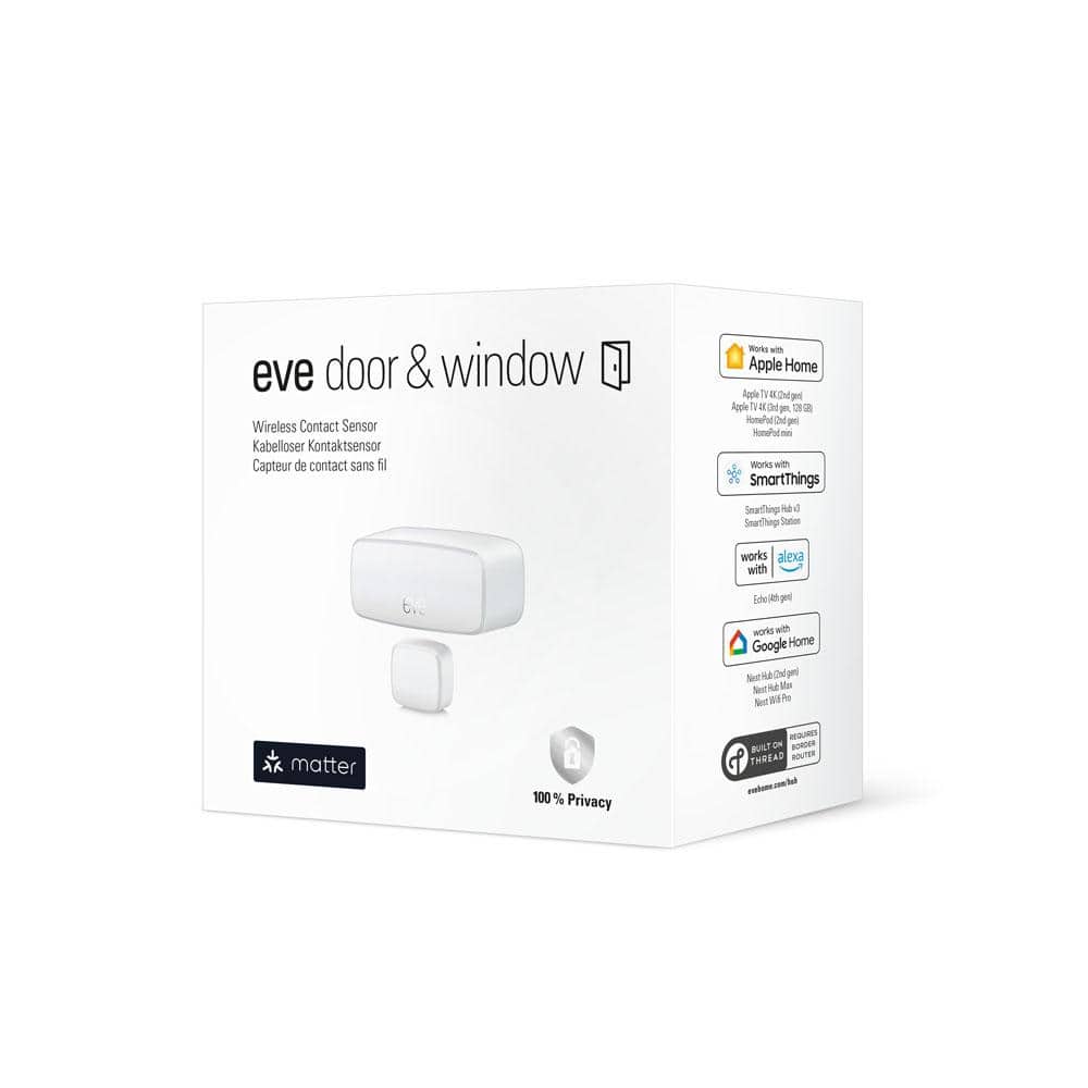 Enhance your home's security and convenience with the Eve Door & Window Smart Contact Sensor. Designed to work with major platforms including Apple Home, SmartThings, Alexa, and Google Home, its Matter and Thread compatibility ensure seamless integration and superior privacy safeguards for your smart home setup.