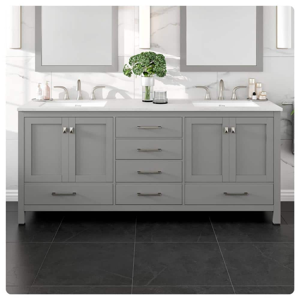 The Eviva Aberdeen 78-inch Double Bath Vanity combines transitional design with premier functionality. Featuring a solid wood frame in a sophisticated gray finish, this vanity is topped with luxurious Italian white Carrara Quartz for elegance in any bathroom. Complemented by white porcelain undermount sinks and brushed nickel hardware, it's a refined choice for both modern and classic decors.