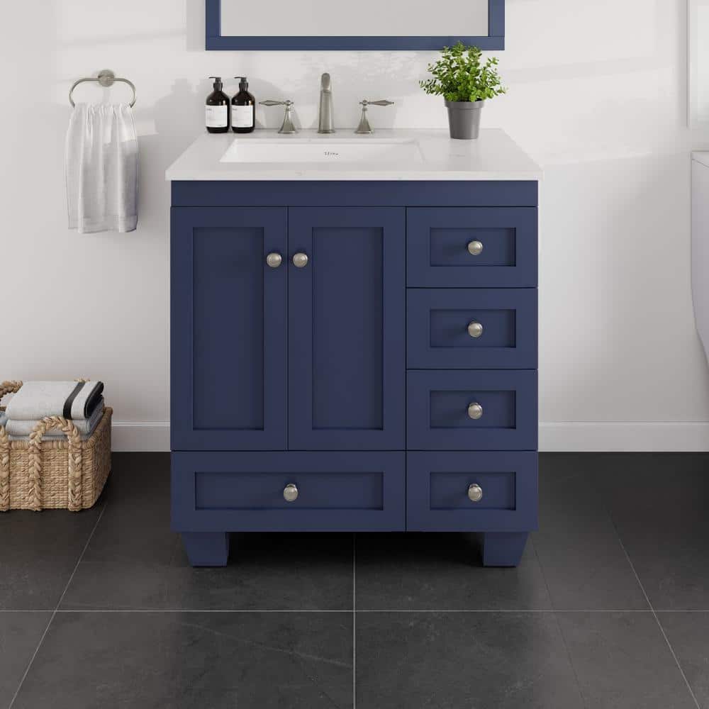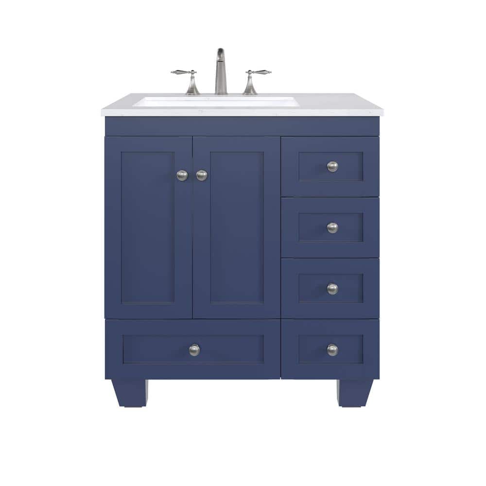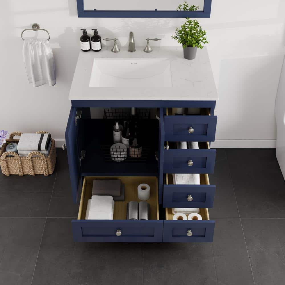 Enhance your bathroom space with the Eviva Acclaim 30" Freestanding Bath Vanity in a striking blue hue. Featuring a luxurious White Carrara Quartz Top and solid wood construction, it offers both durability and elegance. Its modern yet timeless design is complemented by soft-close drawers and brushed nickel hardware, making it a perfect fit for transitional style enthusiasts.
