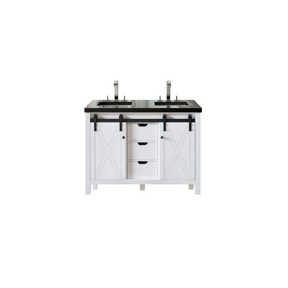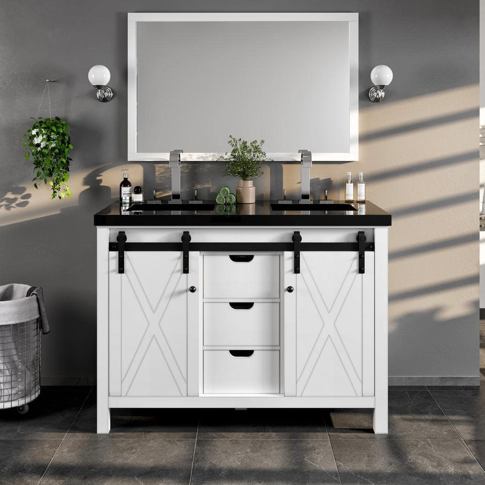 Transform your bathroom with the Eviva Dallas 48" Double Vanity, featuring a striking contrast of a crisp white base and a luxurious black granite top. Built with solid wood, it offers exceptional durability, while the dual undermount black sinks and soft-close drawers provide elegance and functionality.