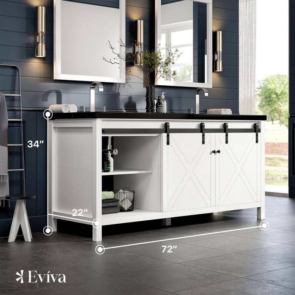 The Eviva Dallas 72-inch Double Bath Vanity combines a sleek modern aesthetic with rustic charm, featuring an Absolute Black Granite top and distinctive barn-style cabinet doors. Carefully crafted from solid rubber and birch wood, this vanity promises superb moisture resistance and enduring elegance, making it a standout addition to any bathroom remodel.