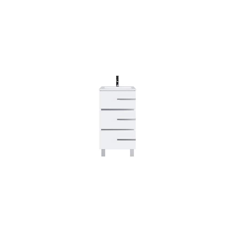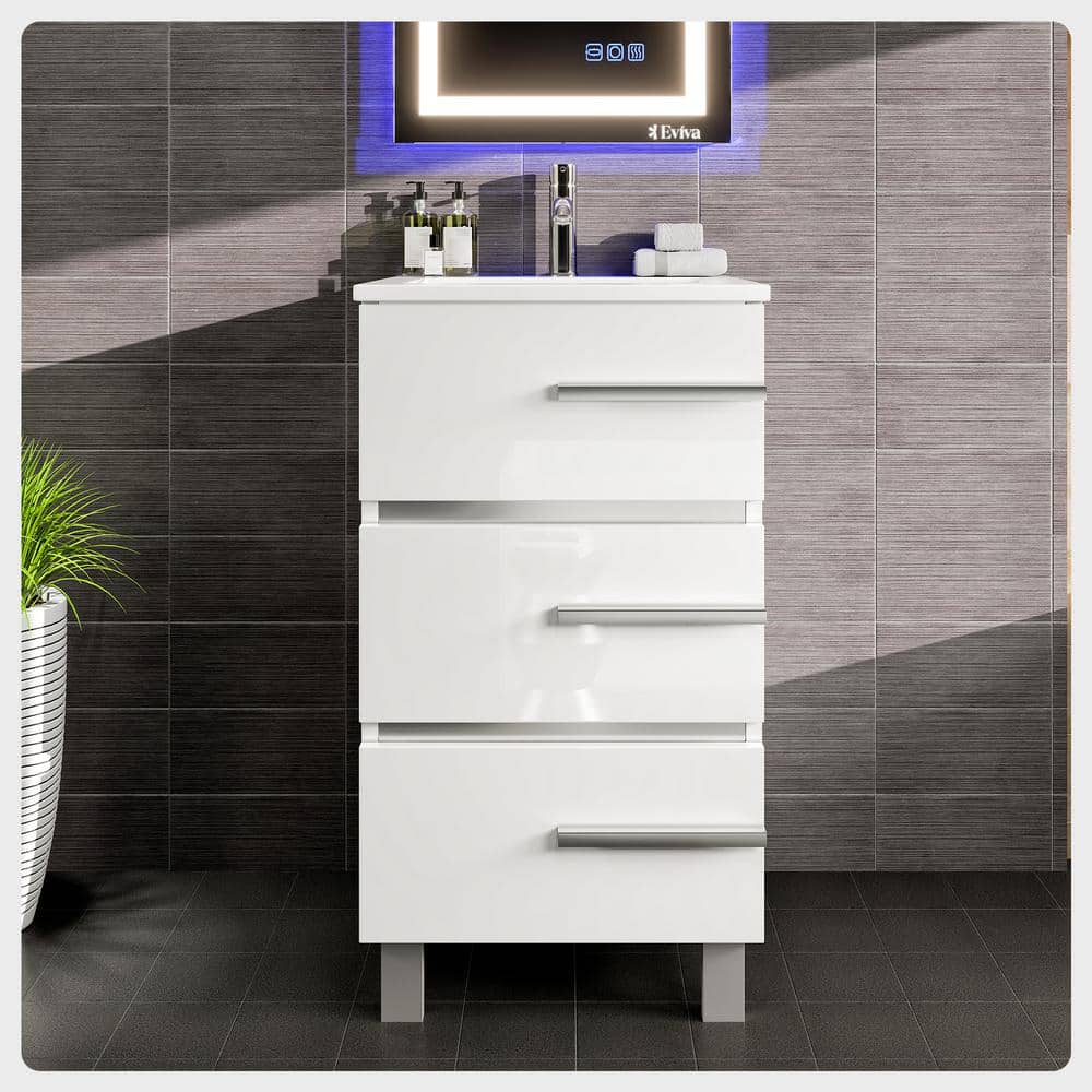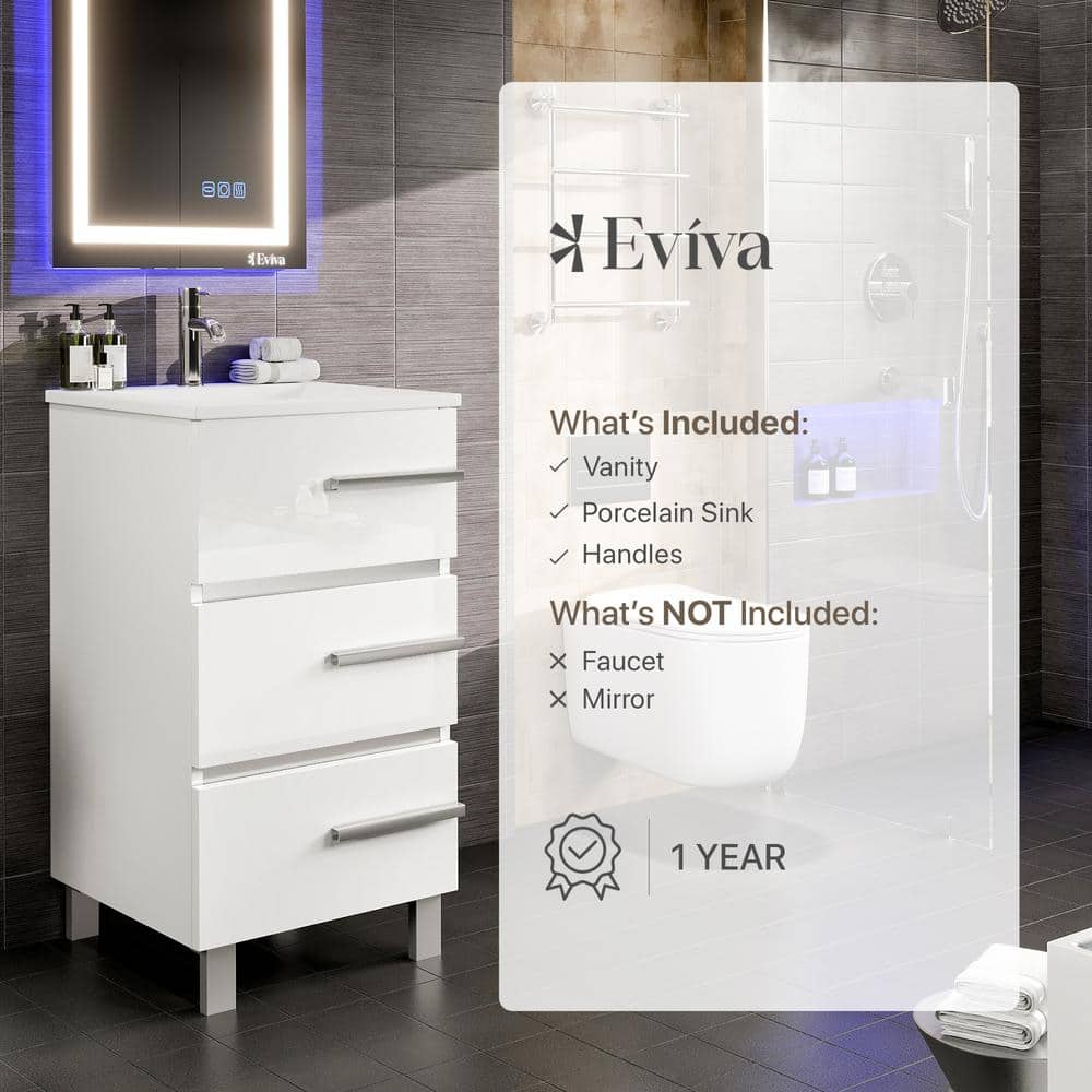 The Eviva Deluxe 20" Freestanding Bath Vanity expertly combines modern design and practical functionality. Featuring a white integrated porcelain sink, this vanity is constructed from durable engineered wood and is finished with chrome hardware for a sleek look. Its compact dimensions make it ideal for both small and spacious bathrooms, ensuring ample storage with three soft-closing drawers.