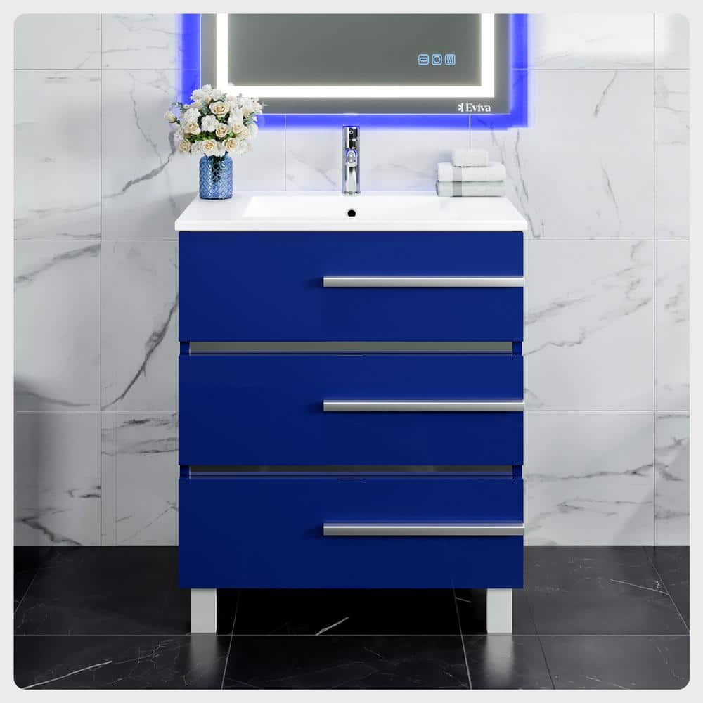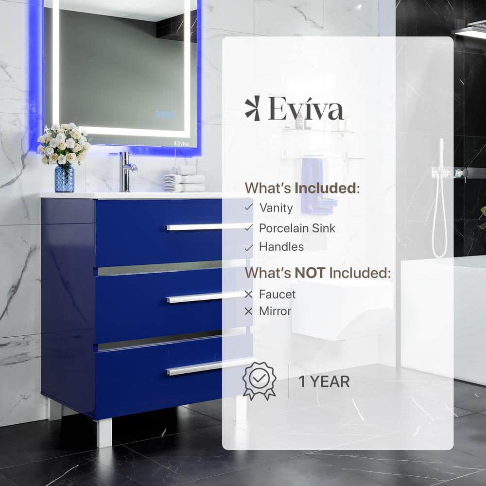 Upgrade your bathroom with the Eviva Deluxe Freestanding Bath Vanity in a striking blue finish. This 24-inch piece features a sleek modern design with engineered wood and chrome hardware, topped with a white integrated porcelain sink. Perfectly crafted for both style and functionality, it includes three soft-closing drawers and an easy-access back panel for plumbing.