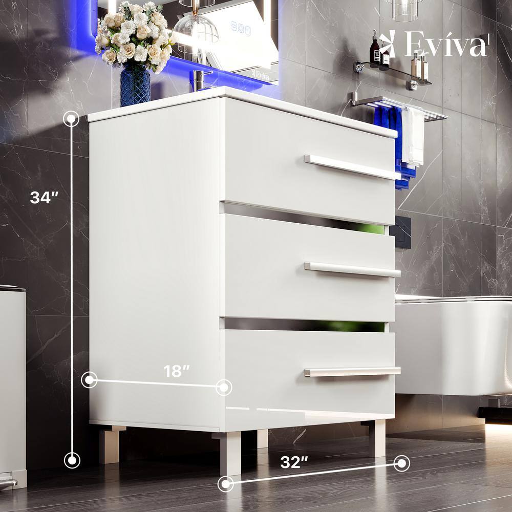 Transform your bathroom into an oasis of calm with the Eviva Deluxe Freestanding Bath Vanity. Its sleek, modern profile captures attention, while the polished chrome hardware adds an element of understated luxury. Imagine pairing this pristine piece with soft linen accessories and chic wall art for a refined touch. Essential for the discerning designer, this vanity blends effortlessly with contemporary décor, truly exemplifying sophisticated living.