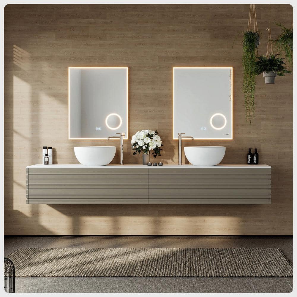The Eviva Dream Floating Bath Vanity acts as a masterstroke of modern sophistication, casting a subtle glamour through its Smog Grey finish. With its striking horizontal grooves, it tantalizes with an interplay of light and shadow that captures any discerning eye. Paired with pristine white vessel sinks, this vanity becomes an arresting focal point. Style it with minimalist chrome fixtures and lush greenery for a splash of organic freshness, making it an indispensable element in any luxury bathroom.
