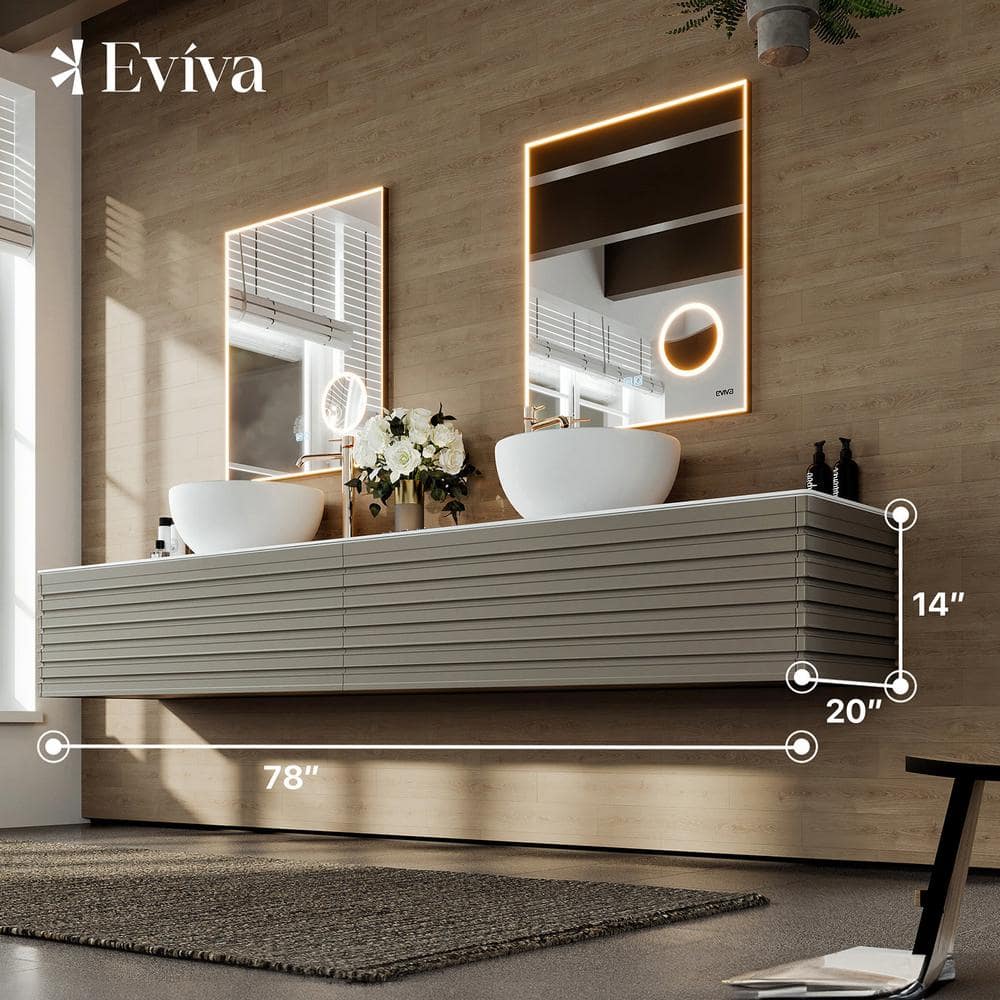 The Eviva Dream 78 in. Floating Bath Vanity transforms your bathroom with its sleek, modern design. Featuring Smog Grey engineered wood and durable white solid surface sinks, it combines functionality with luxury. Innovative push-to-open drawers provide ample storage and smooth, silent operation.