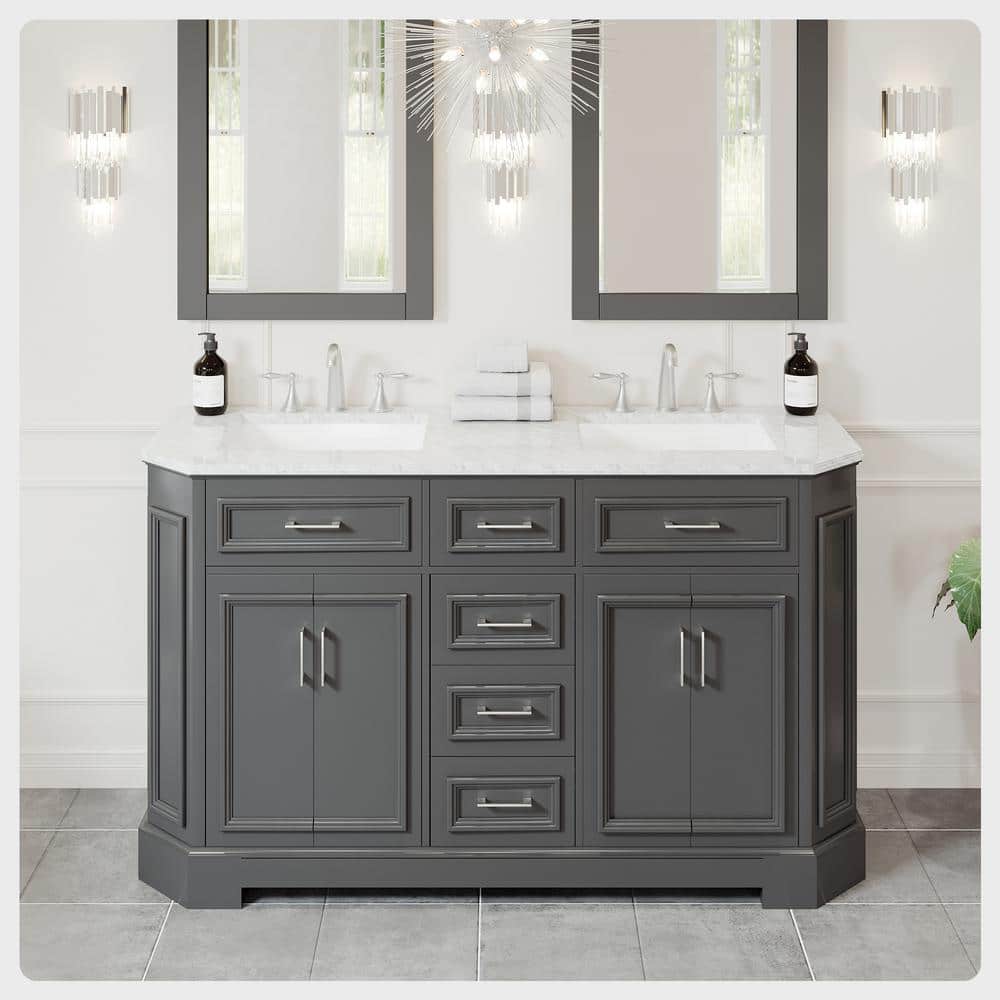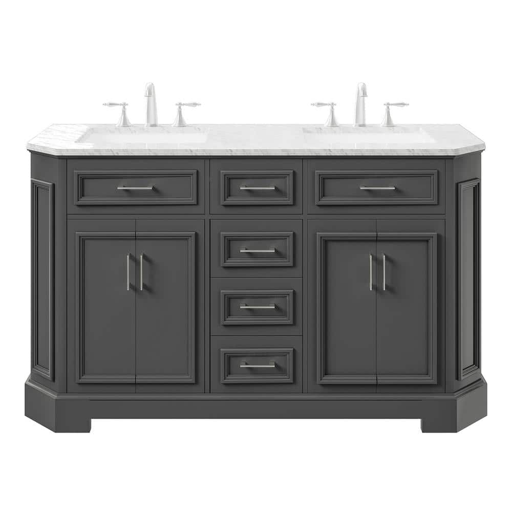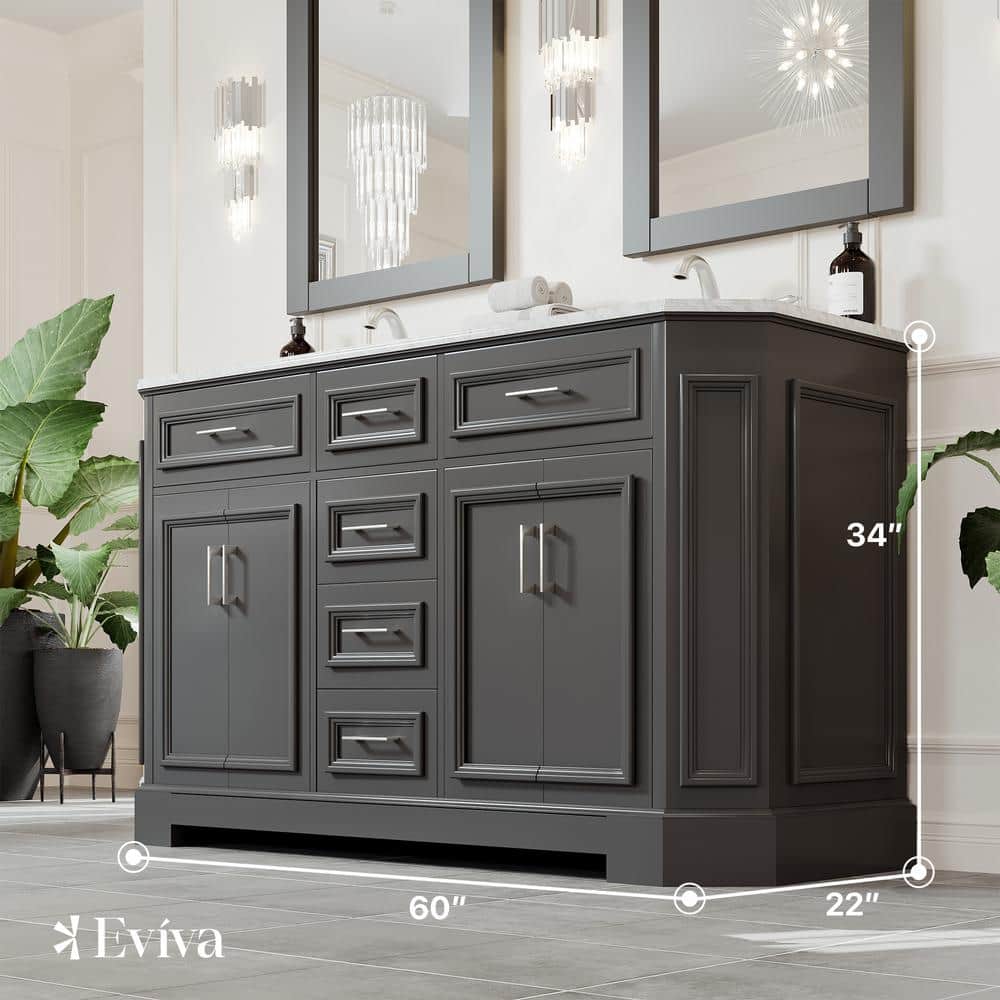 Eviva Glory 60 in W x 22 in. D x 33 in. H Double Bathroom Vanity in Dark Gray with White Carrara Marble Top with White Sinks