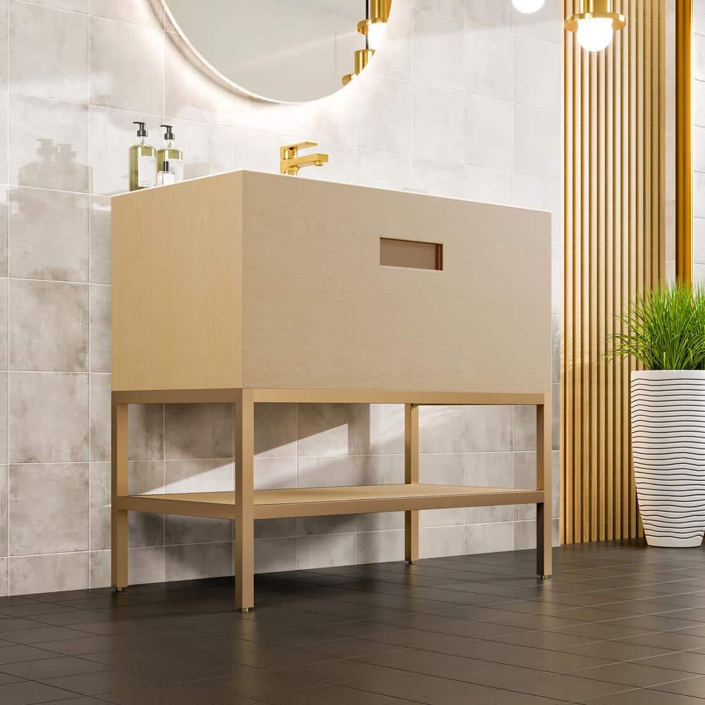 A: The hardware and legs of the vanity are finished in a luxurious brushed gold, adding to the elegant design.