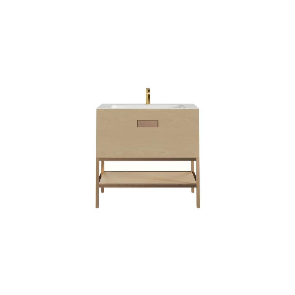 The Eviva Iris Bathroom Vanity brings modern elegance to your home with a fusion of contemporary design and luxurious brushed gold accents. Crafted from high-quality engineered wood, it features a sleek, integrated white solid surface sink that ensures ease of maintenance and enduring style. Complete with soft-closing drawers and an exposed back for efficient plumbing access, this vanity epitomizes both beauty and functionality in any bathroom space.