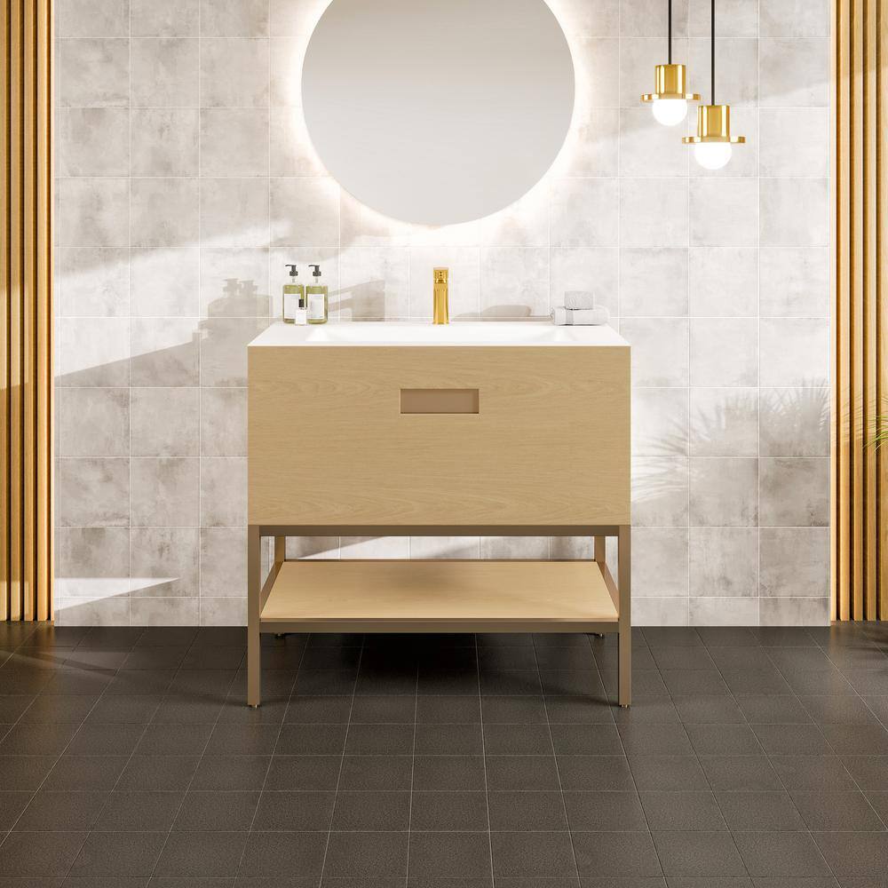 Imagine your space elevated by the refined warmth of the Eviva Iris Vanity, where the richness of natural oak harmonizes with the shimmering allure of brushed gold. Let the integrated white sink become the understated star of your morning routines, offering both form and function. Pair it with soft, muted wall colors and accessories to create a serene escape that breathes opulence. A must-have for those who seek to blend modern luxury with practical design.