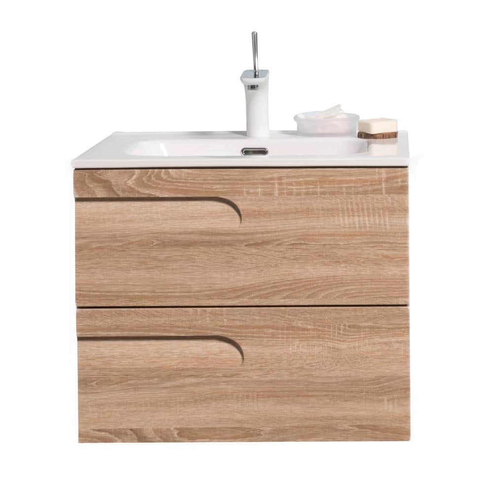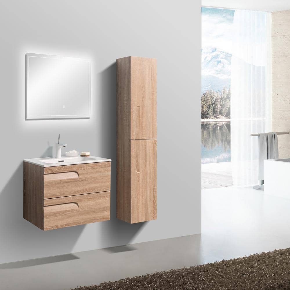 The Eviva Joy Floating Bathroom Vanity in Maple exudes modern elegance with its sleek, wall-mounted design. Complete with a white porcelain top and integrated sink, this Spanish-made vanity features premium engineering and soft-closing drawers, offering both style and functionality for contemporary bathroom spaces.