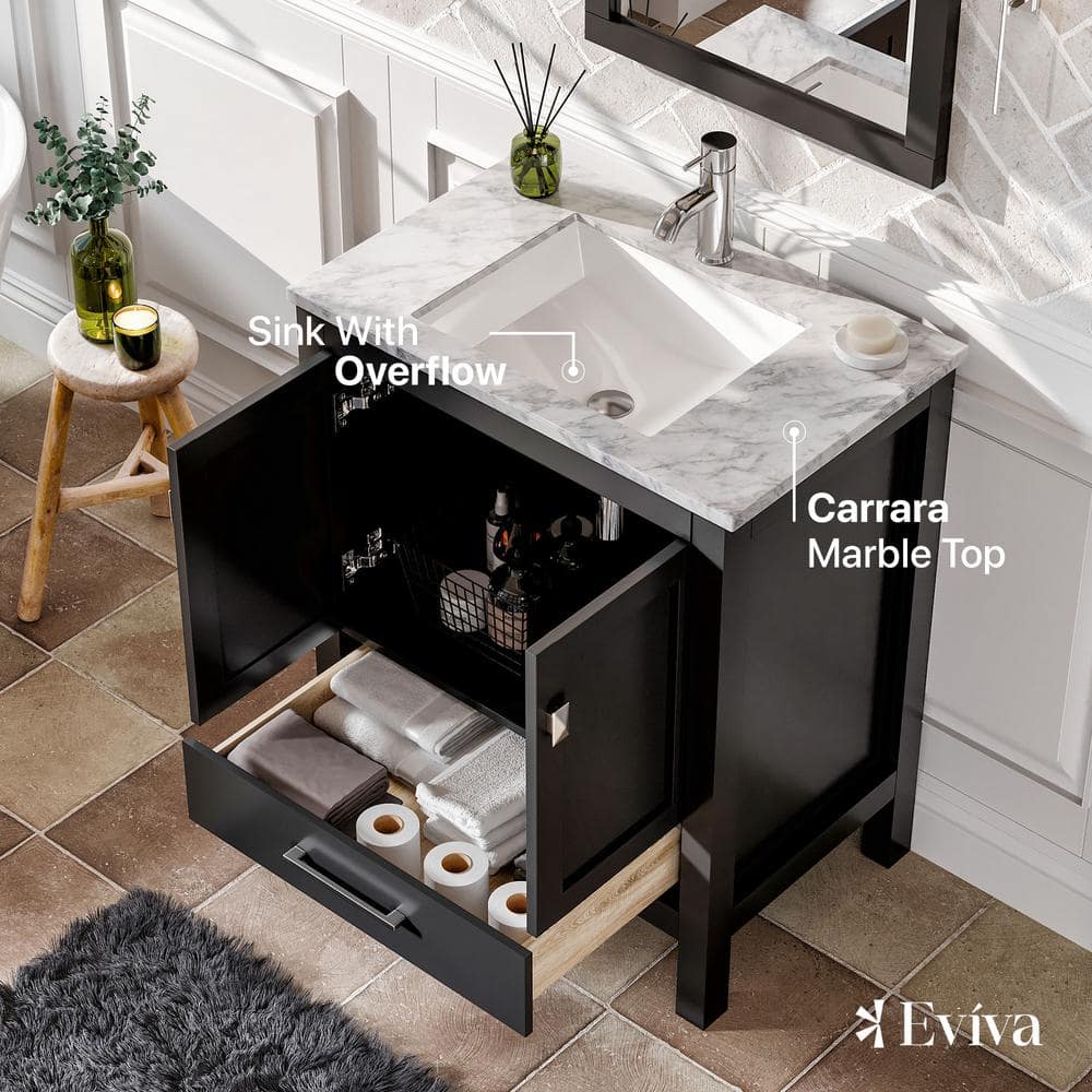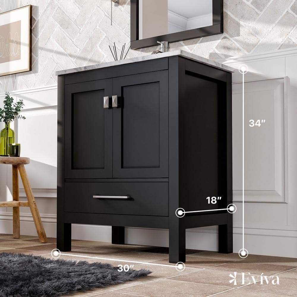 Upgrade your bathroom to a sophisticated sanctuary with the Eviva London Bathroom Vanity. This 30-inch freestanding piece combines solid wood construction and an exquisite White Carrara Marble top, offering both elegance and practical storage solutions. With its transitional style, it seamlessly complements both modern and classic decors.