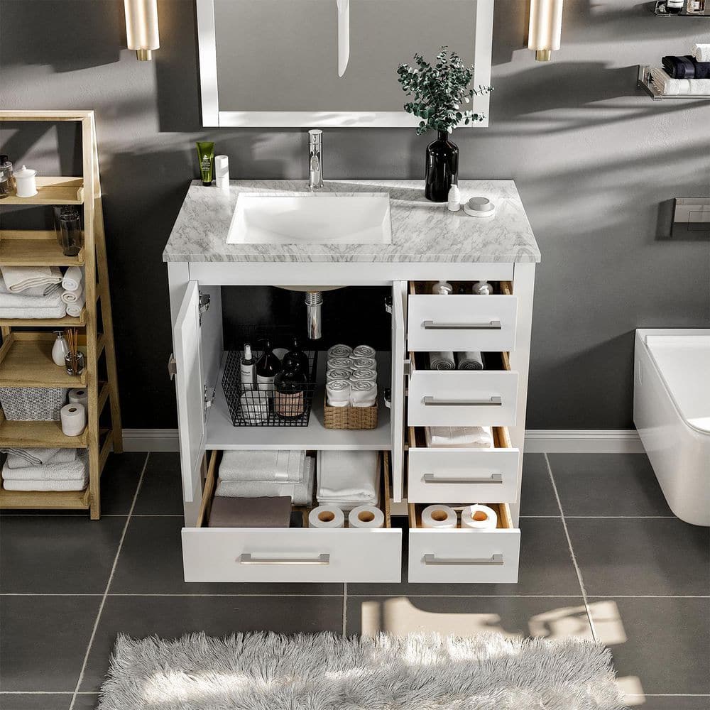 - White Carrara Marble Top: Exudes luxury and sophistication, perfect for elevating bathroom aesthetics.