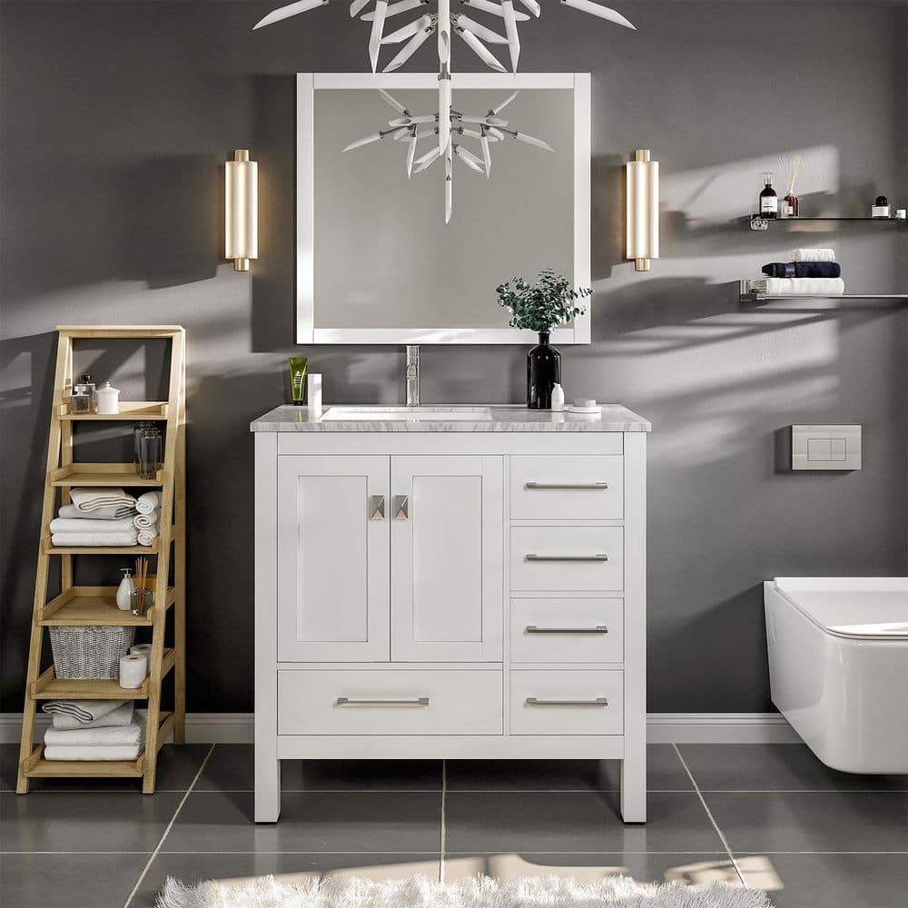The Eviva London Bathroom Vanity marries traditional elegance with modern functionality, featuring a pristine White Carrara marble top and a robust solid wood structure. With its unique 18-inch depth, this vanity is perfect for maximizing space while providing ample storage through its soft-closing doors and drawers, making it ideal for any stylish bathroom update.