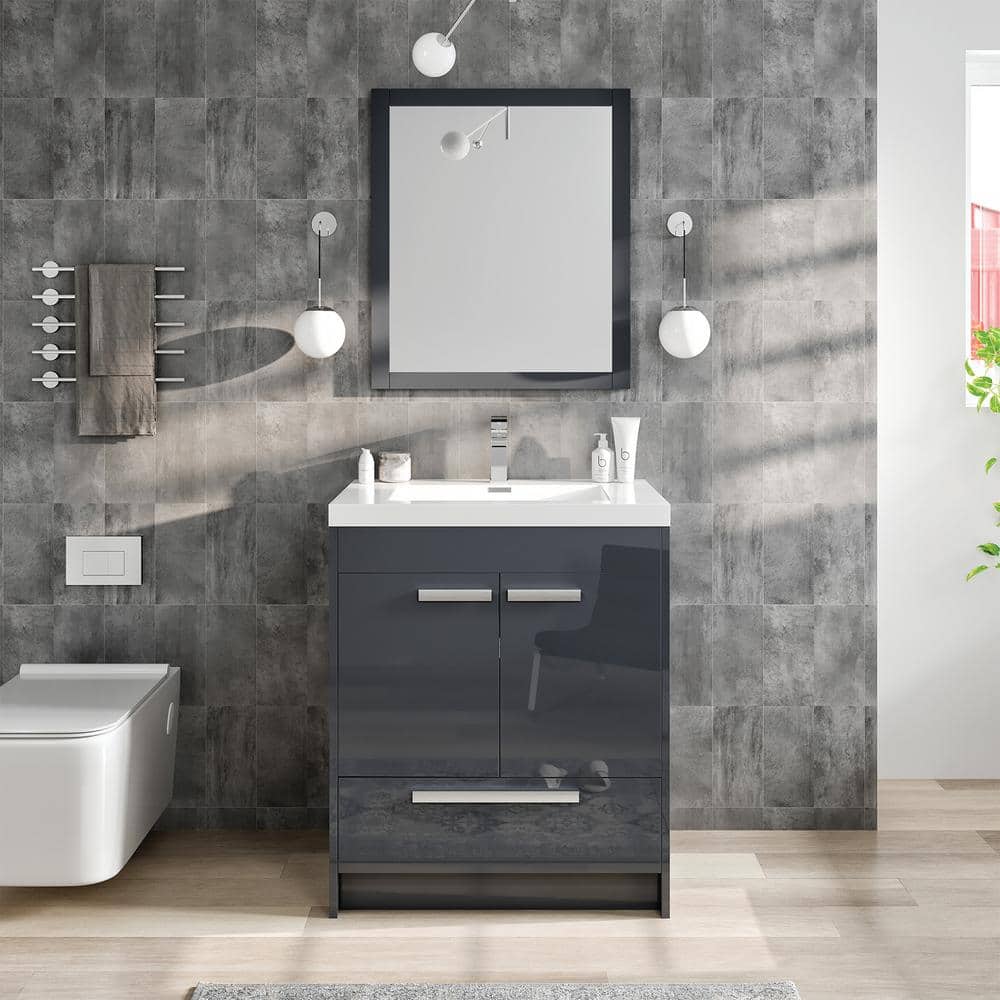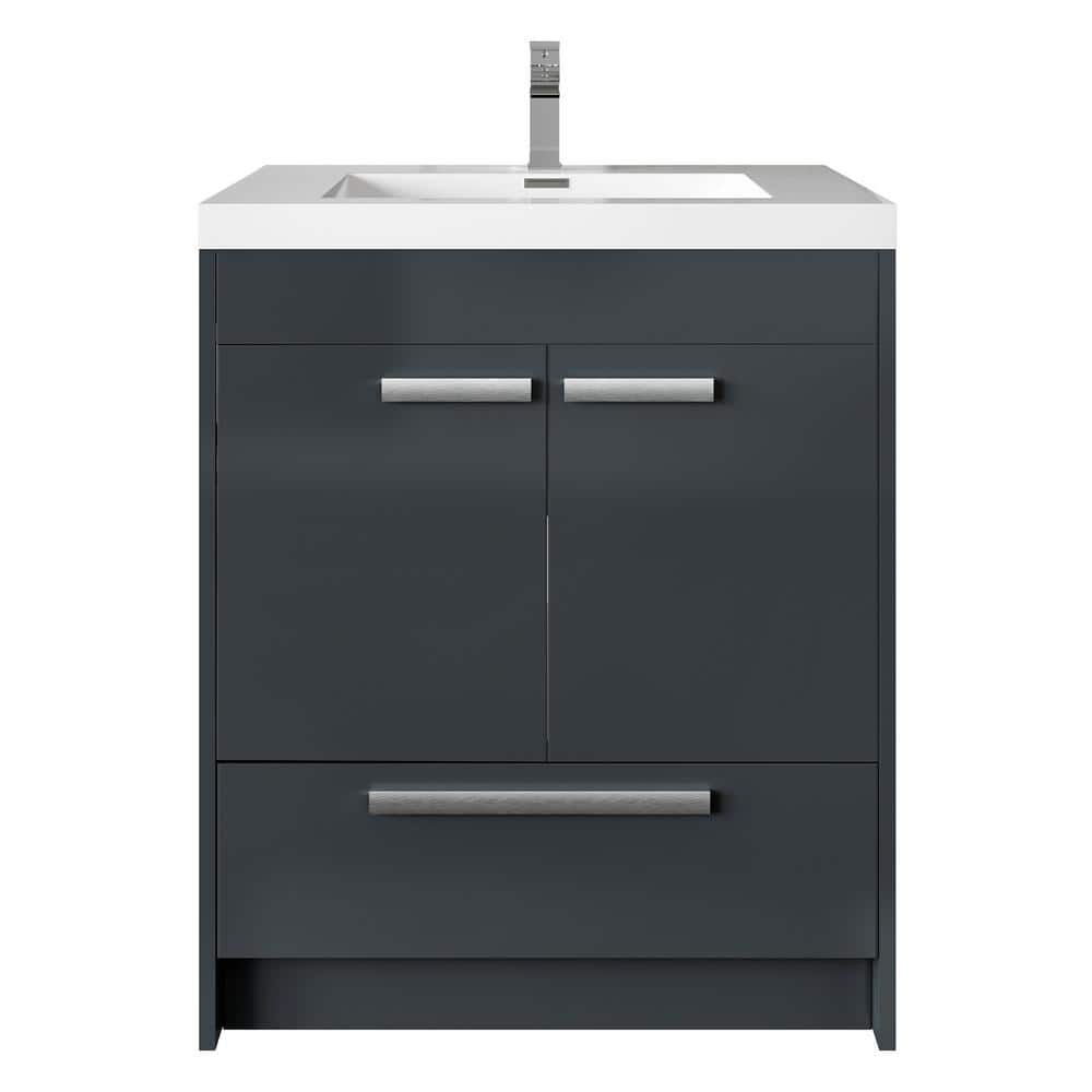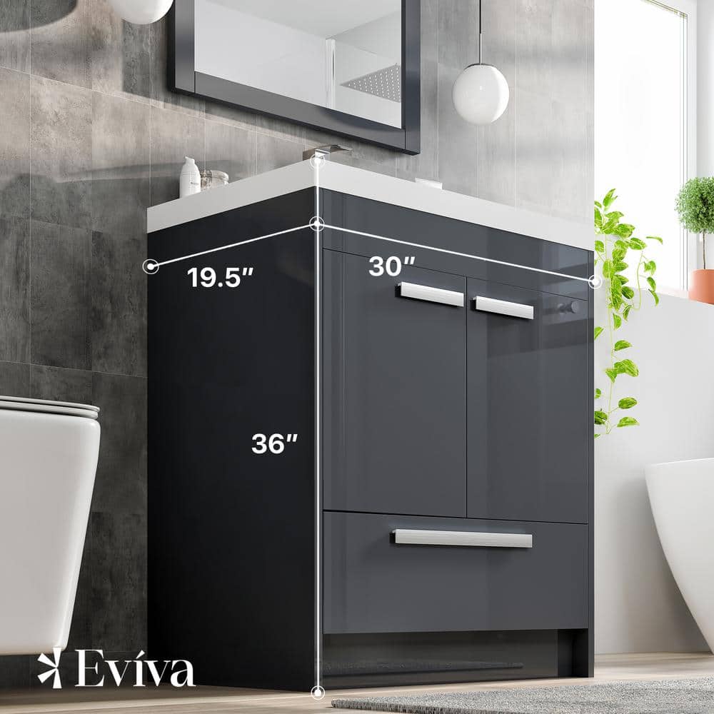 Experience modern elegance and functionality with the Eviva Lugano 30" Gray Bath Vanity. Designed with high-grade, water-resistant materials and a stain-resistant acrylic countertop, this vanity offers both durability and style. The integrated sink and sleek, soft-closing drawers make it both practical and visually appealing.