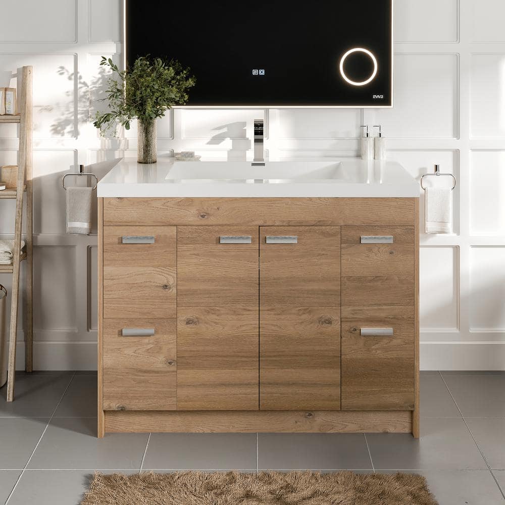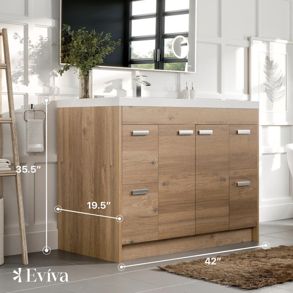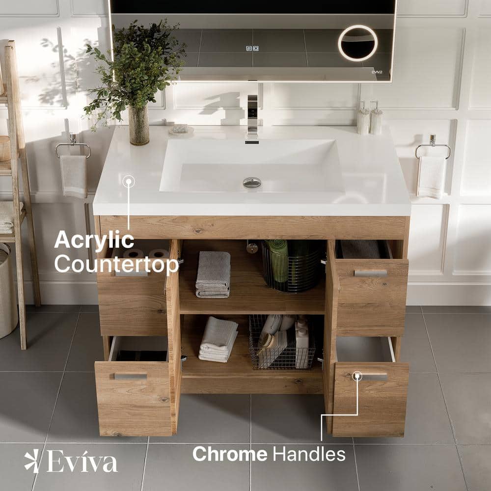 Elevate your bathroom with the Eviva Lugano 42-inch vanity, combining sleek modern design with robust functionality. Featuring a natural oak finish and a durable acrylic top with an integrated sink, this freestanding vanity is both stylish and practical, offering ample storage through soft-closing drawers and doors.