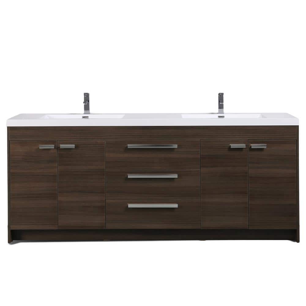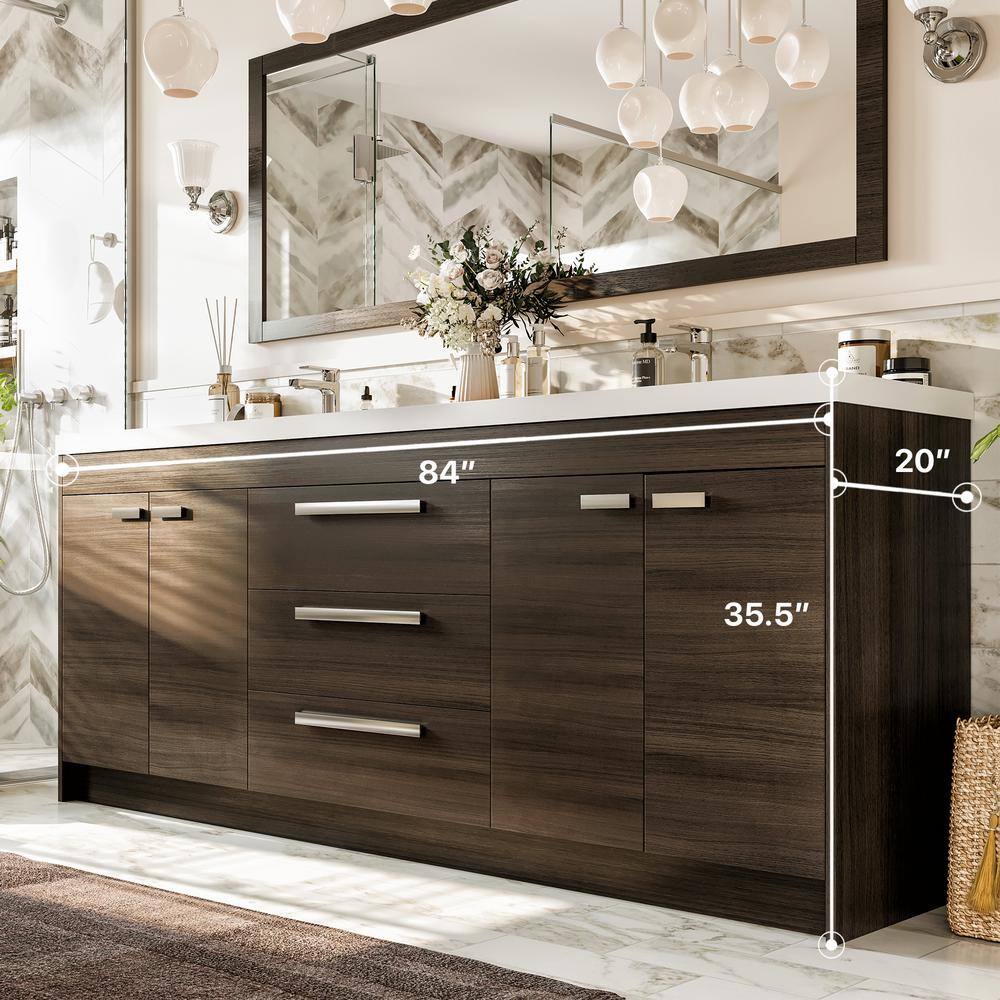 The Eviva Lugano 84-inch Double Bath Vanity in Gray Oak combines modern aesthetics with practical functionality, perfect for contemporary bathrooms. Featuring a sleek white acrylic top and integrated sinks, this vanity offers a pristine, low-maintenance finish. Soft closing drawers and doors enhance its ease of use, making it ideal for both professional contractors and home DIYers.