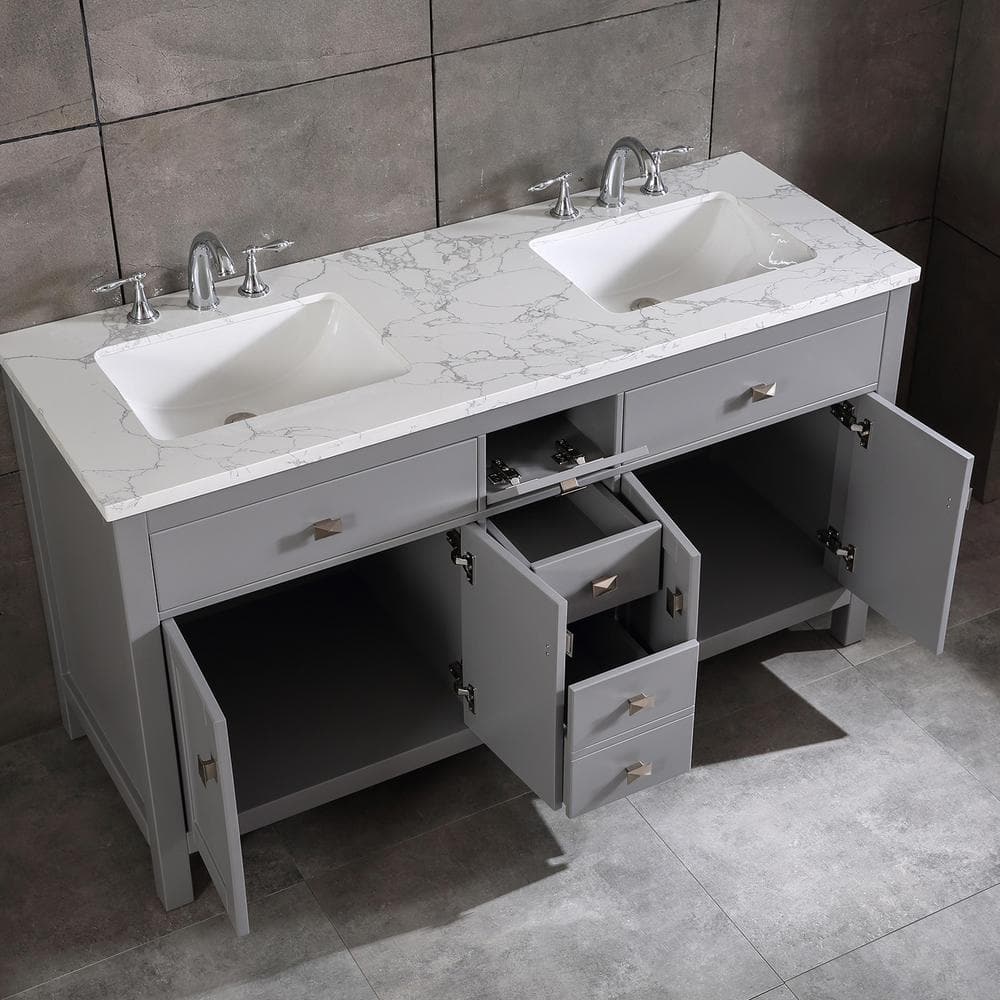 Eviva Memphis 60 in. W x 22 in. D x 33.7 in. H Double Bathroom Vanity in Gray with White Carrara Style Stone Top with Sinks