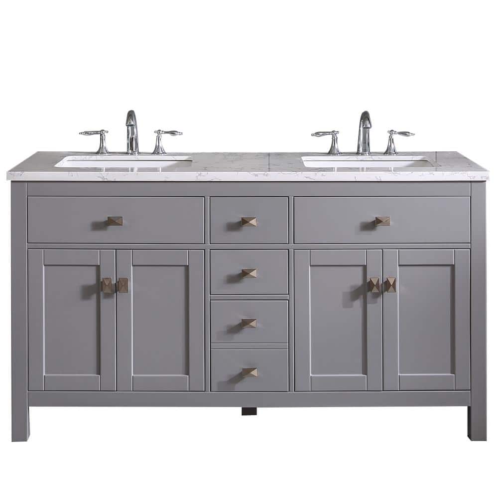 Elevate your bathroom space with the Eviva Memphis 60-inch double vanity, featuring a sophisticated gray finish and a stunning Carrara-style stone top. Perfectly crafted for transitional styles, this vanity combines elegance with functionality, offering abundant storage and pre-installed porcelain sinks.
