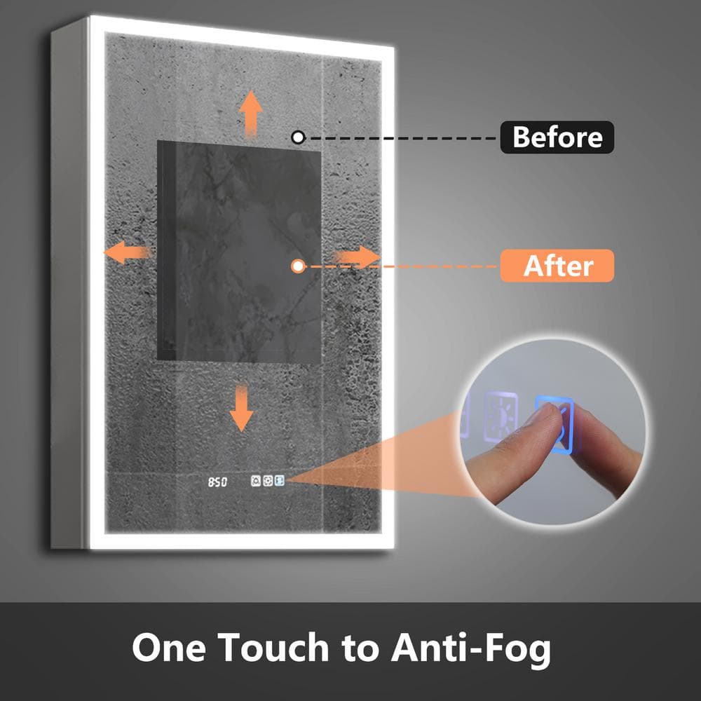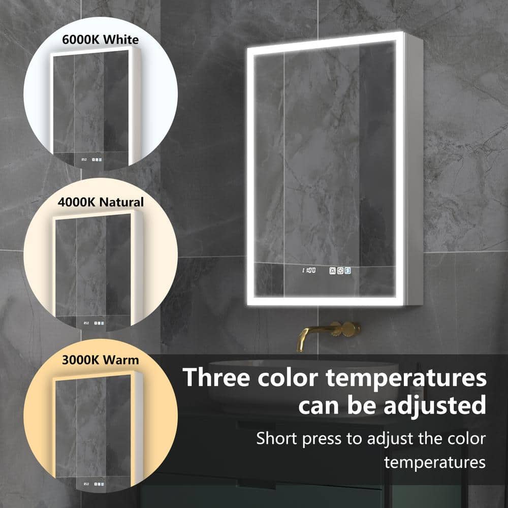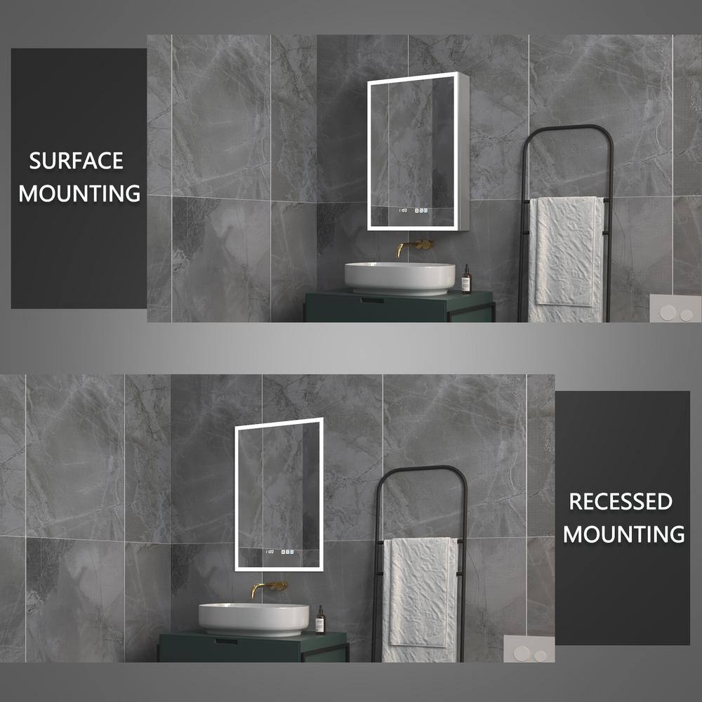 Elevate your bathroom's style and functionality with the ExBrite 20x30" Medicine Cabinet, designed with a sleek aluminum build. This recessed or surface-mounted cabinet features a mirrored door with integrated LED lighting and a practical clock, making it a modern essential for any bathroom. Its thoughtful design includes fog-free technology and USB/electrical outlets to keep you connected with ease.