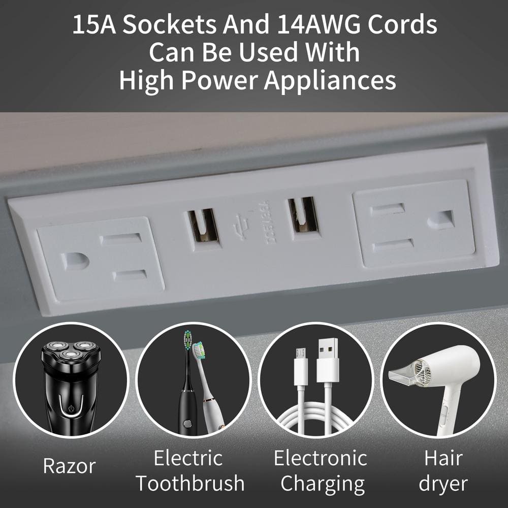 Convenient Outlets: Features electrical and USB outlets for easy access to charging and powering devices.