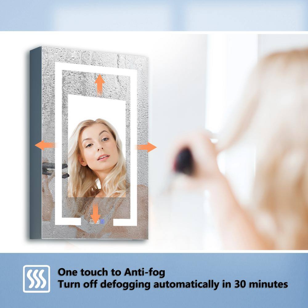 Elevate your bathroom's functionality and style with the ExBrite 20 in. x 32 in. LED Medicine Cabinet. Featuring a sleek, frameless design and integrated LED lighting, this cabinet is perfect for makeup application and grooming. Enjoy modern convenience with its anti-fog technology, adjustable shelves, and built-in USB and socket outlets.