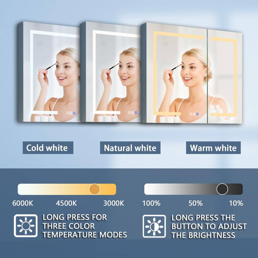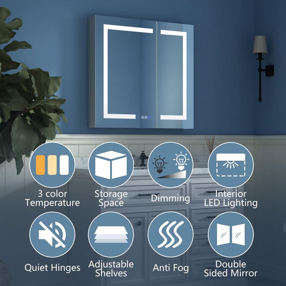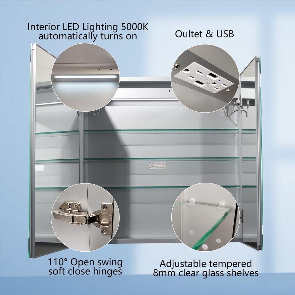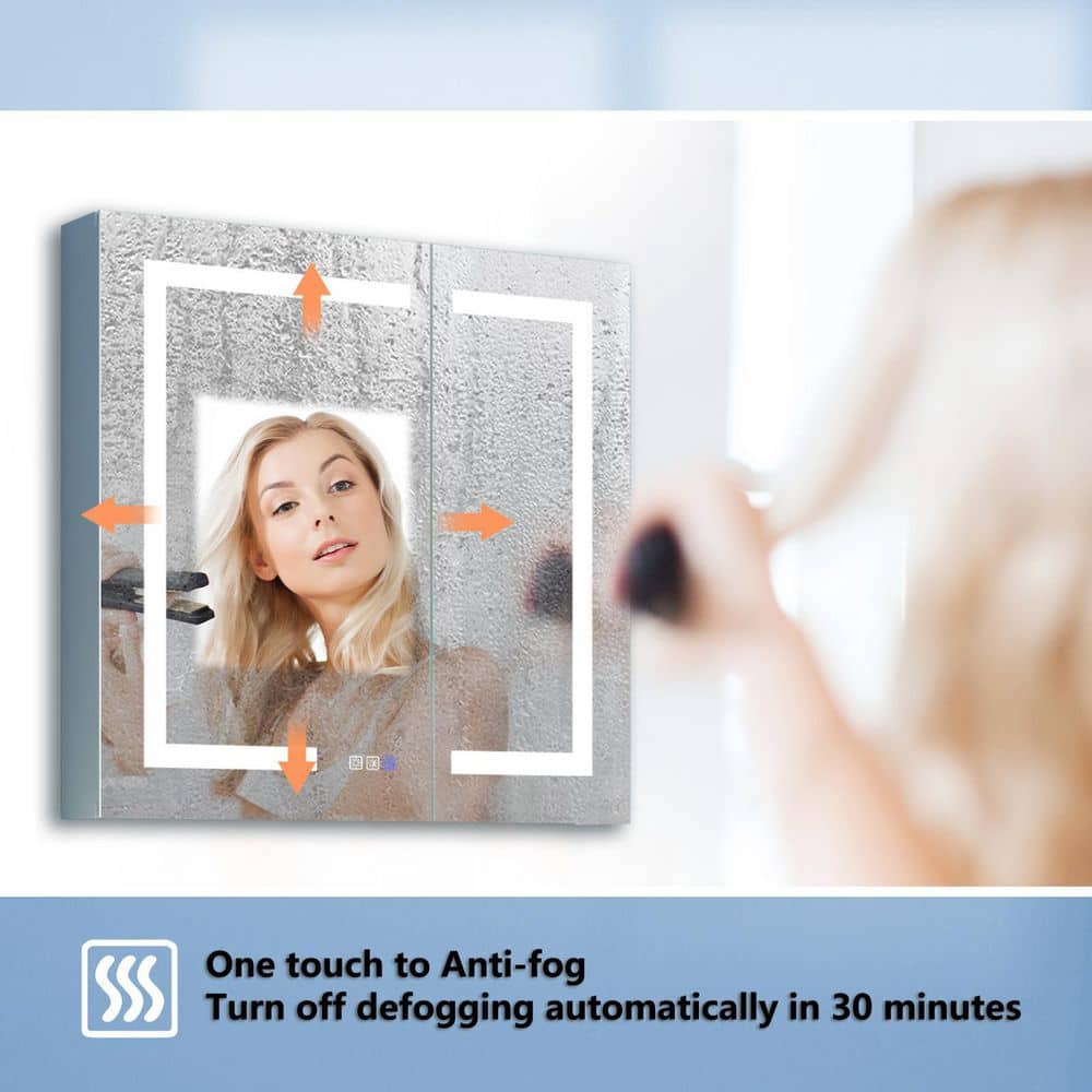 Illuminate and organize your bathroom with the ExBrite 30" x 30" Medicine Cabinet. This elegant silver aluminum cabinet features a dimmable LED frame and anti-fog mirror, ensuring convenience and style in one package. With adjustable glass shelves and built-in outlets, it's the perfect multifunctional solution for a modern bathroom.