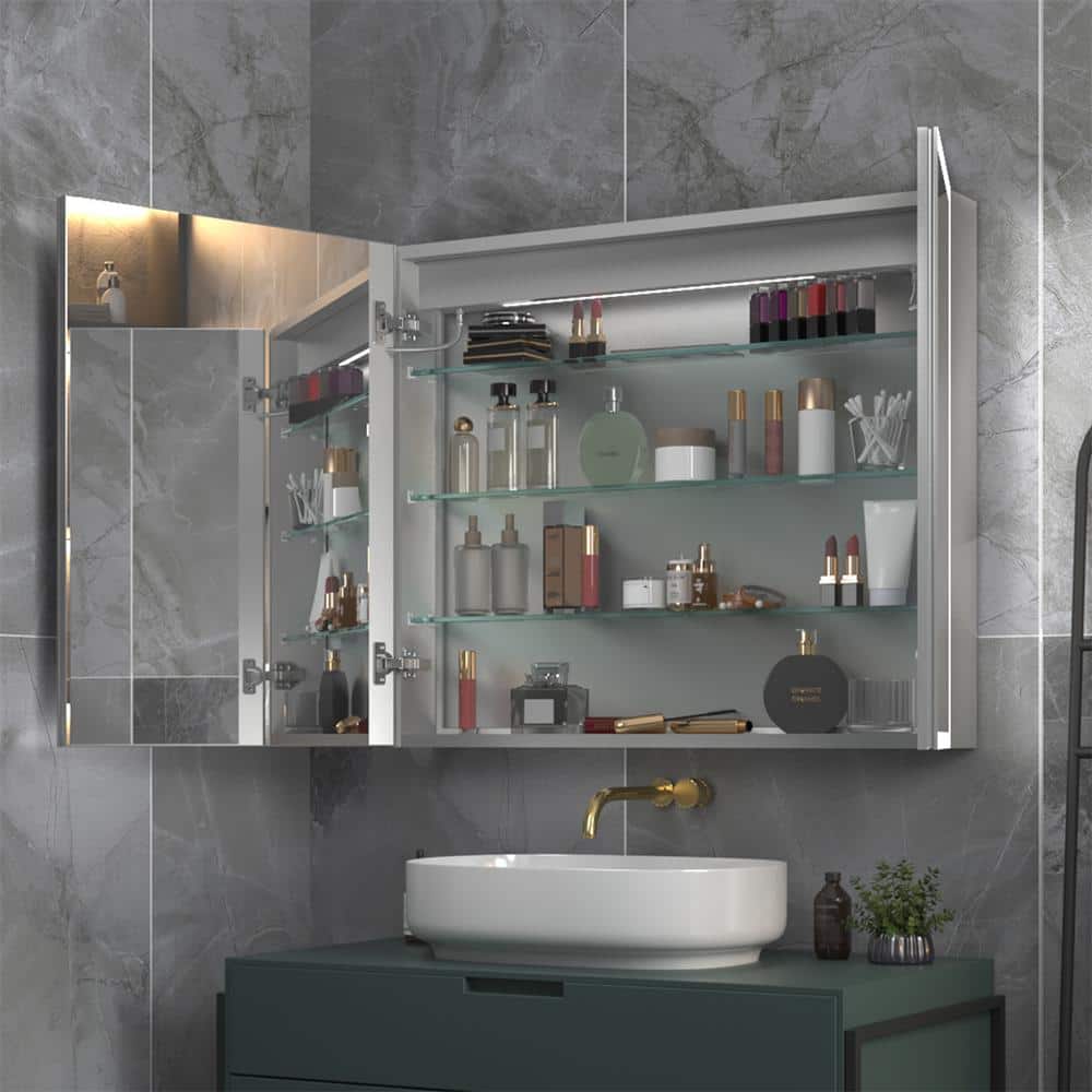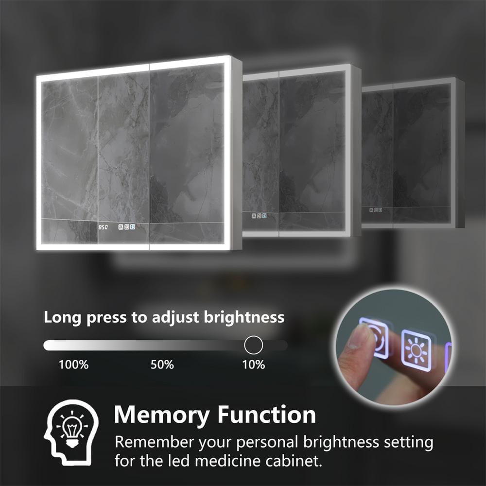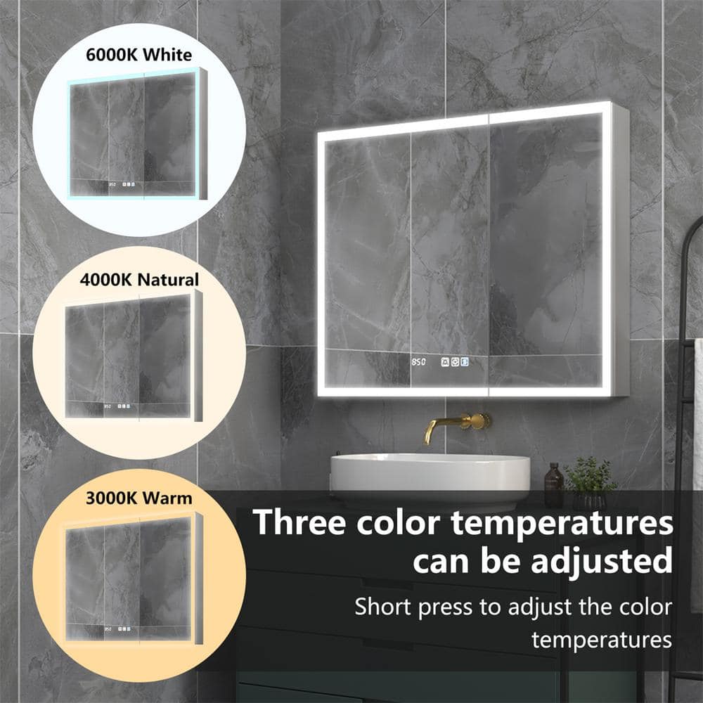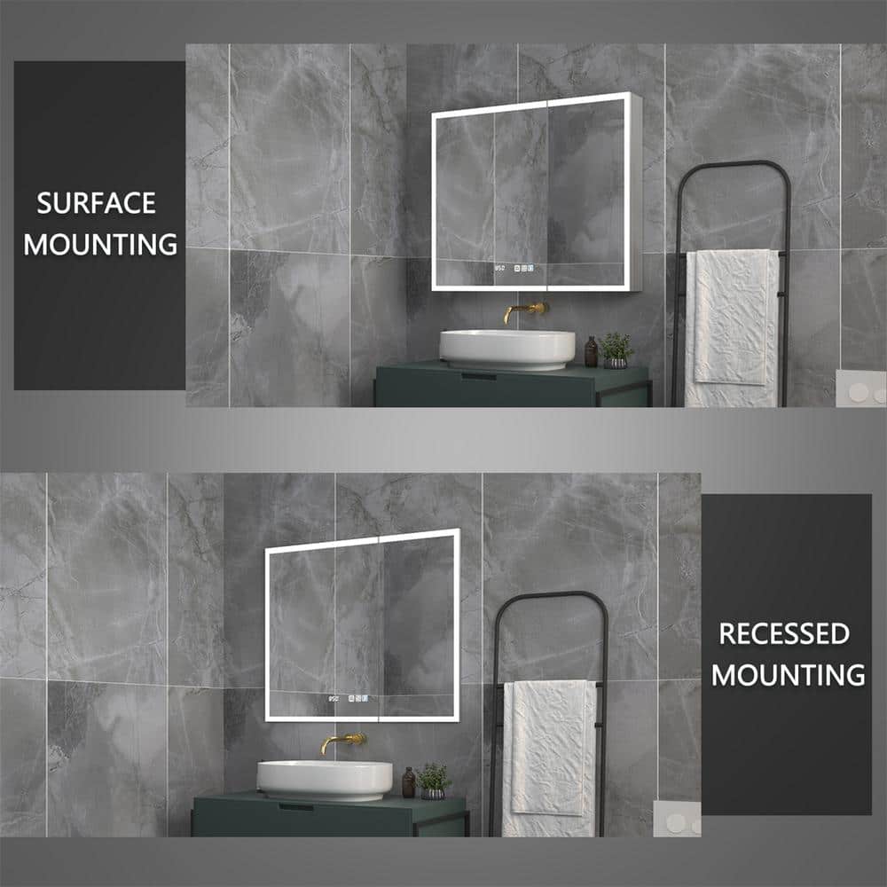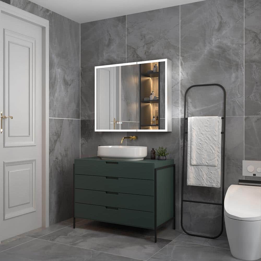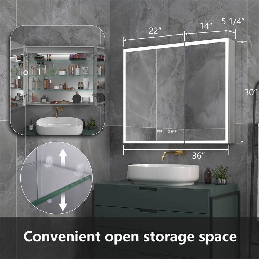 Upgrade your bathroom with the ExBrite 36-inch Medicine Cabinet. This sleek silver aluminum cabinet combines modern technology with elegant design, featuring an integrated dimmable LED light, a built-in clock, and a defogger for ultimate convenience. With dual-swing mirrored doors and sensor-activated lighting, it offers ample storage while adding a sophisticated touch to any bathroom.
