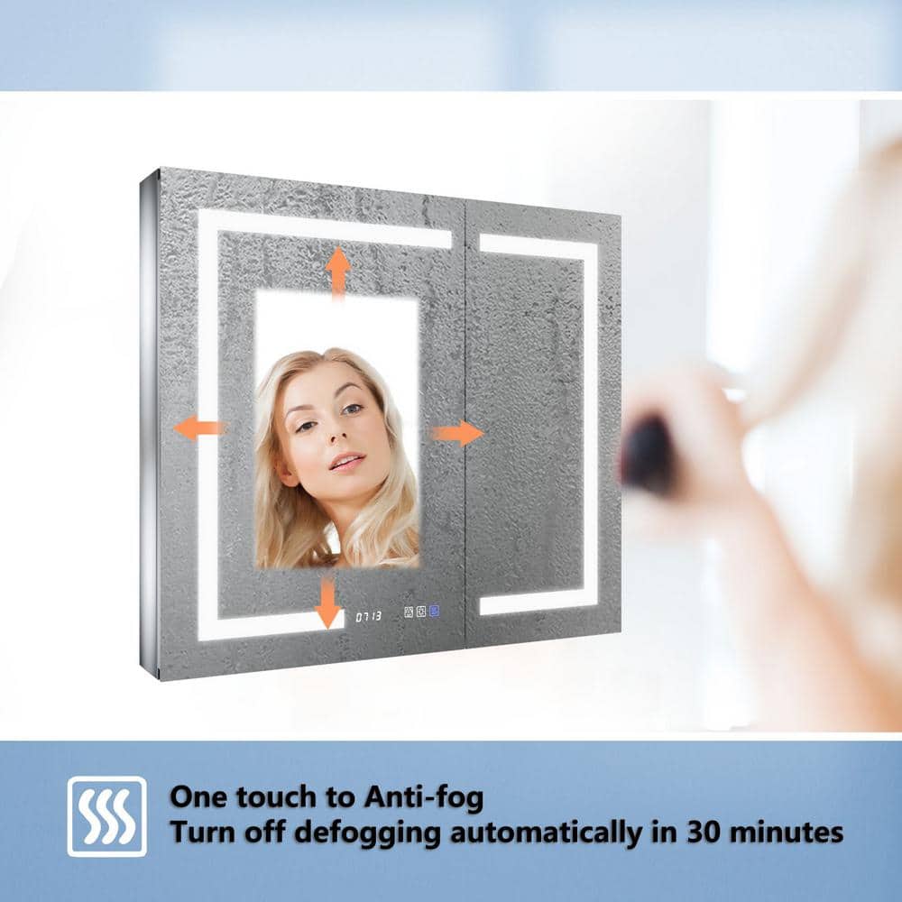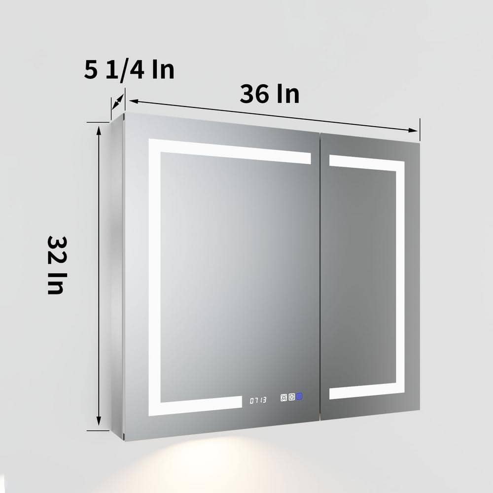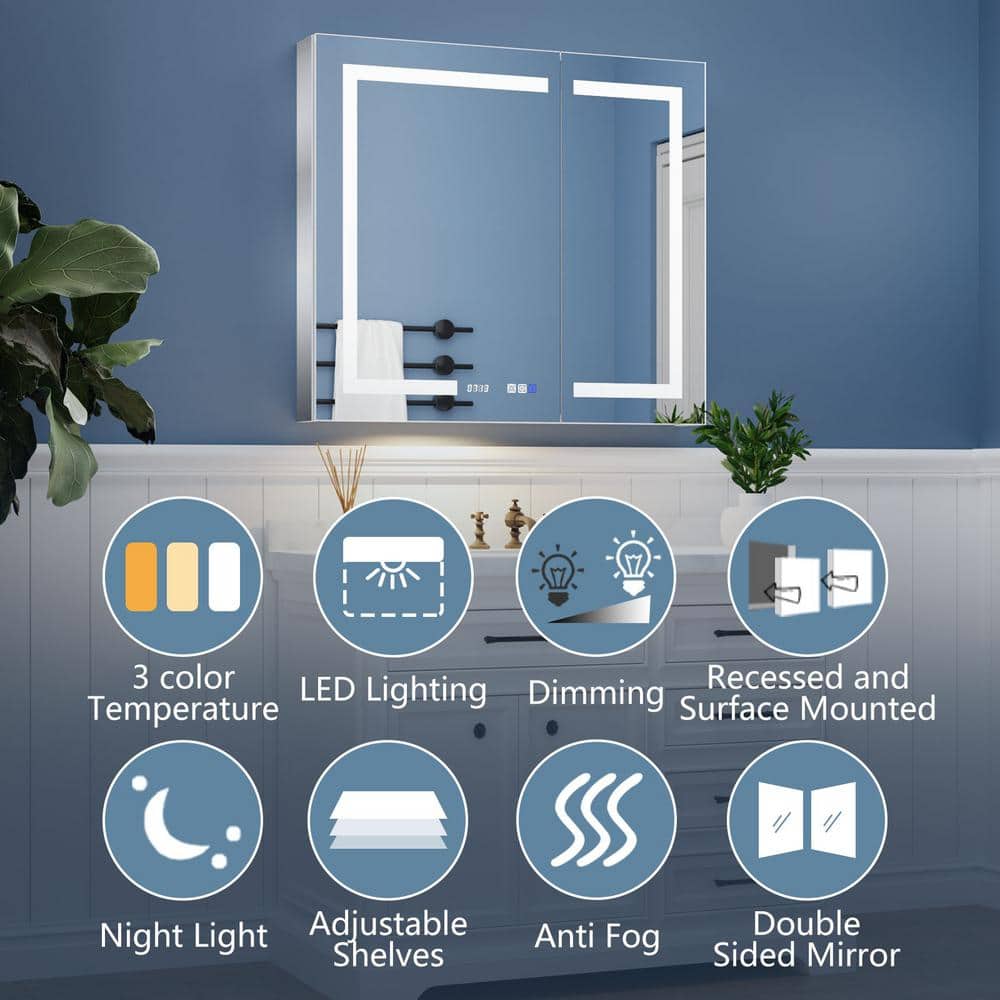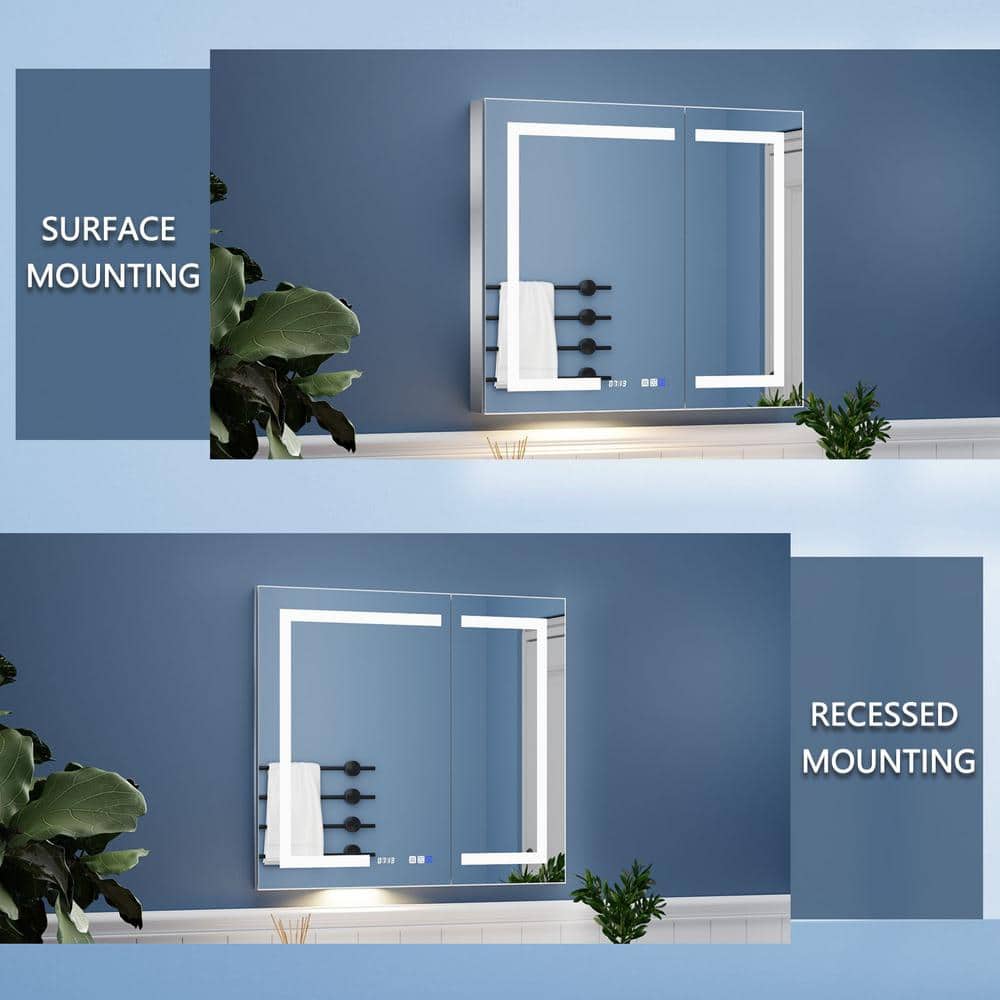 ExBrite 36 in. W x 32 in. H Rectangular Silver Aluminum Recessed/Surface Mount Medicine Cabinet with Mirror, LED and Clock