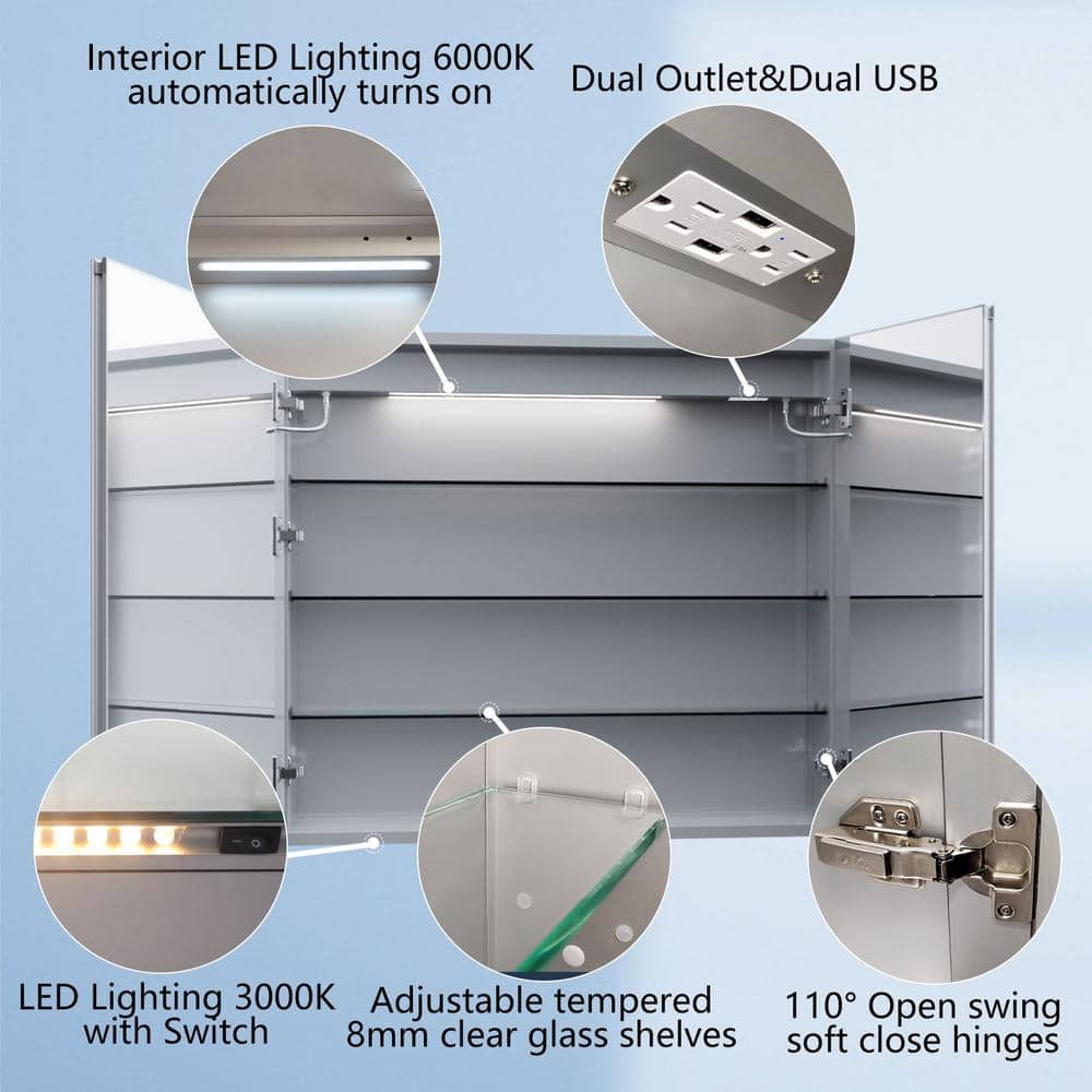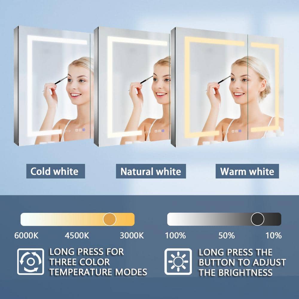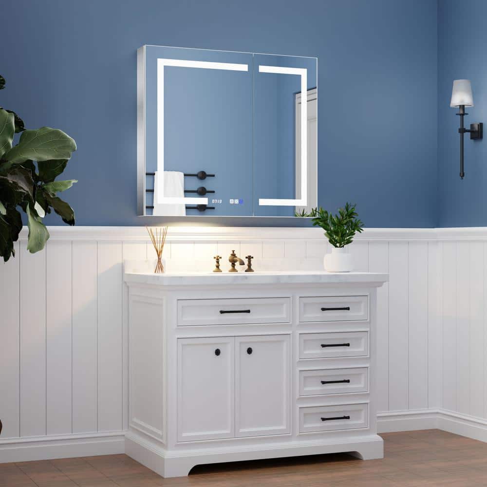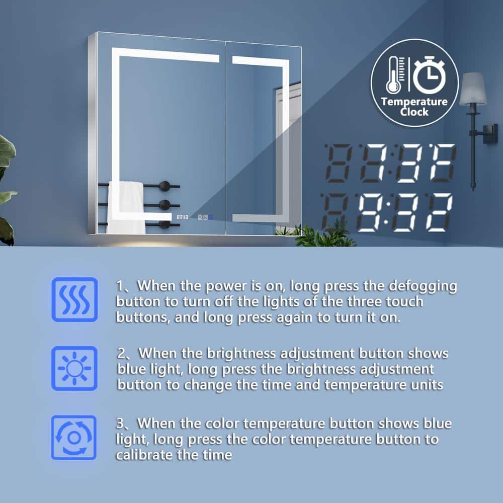 ExBrite 36 in. W x 32 in. H Rectangular Silver Aluminum Recessed/Surface Mount Medicine Cabinet with Mirror, LED and Clock