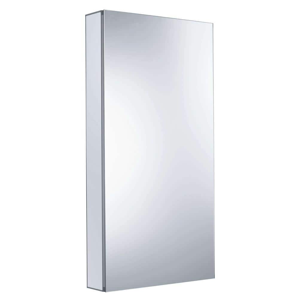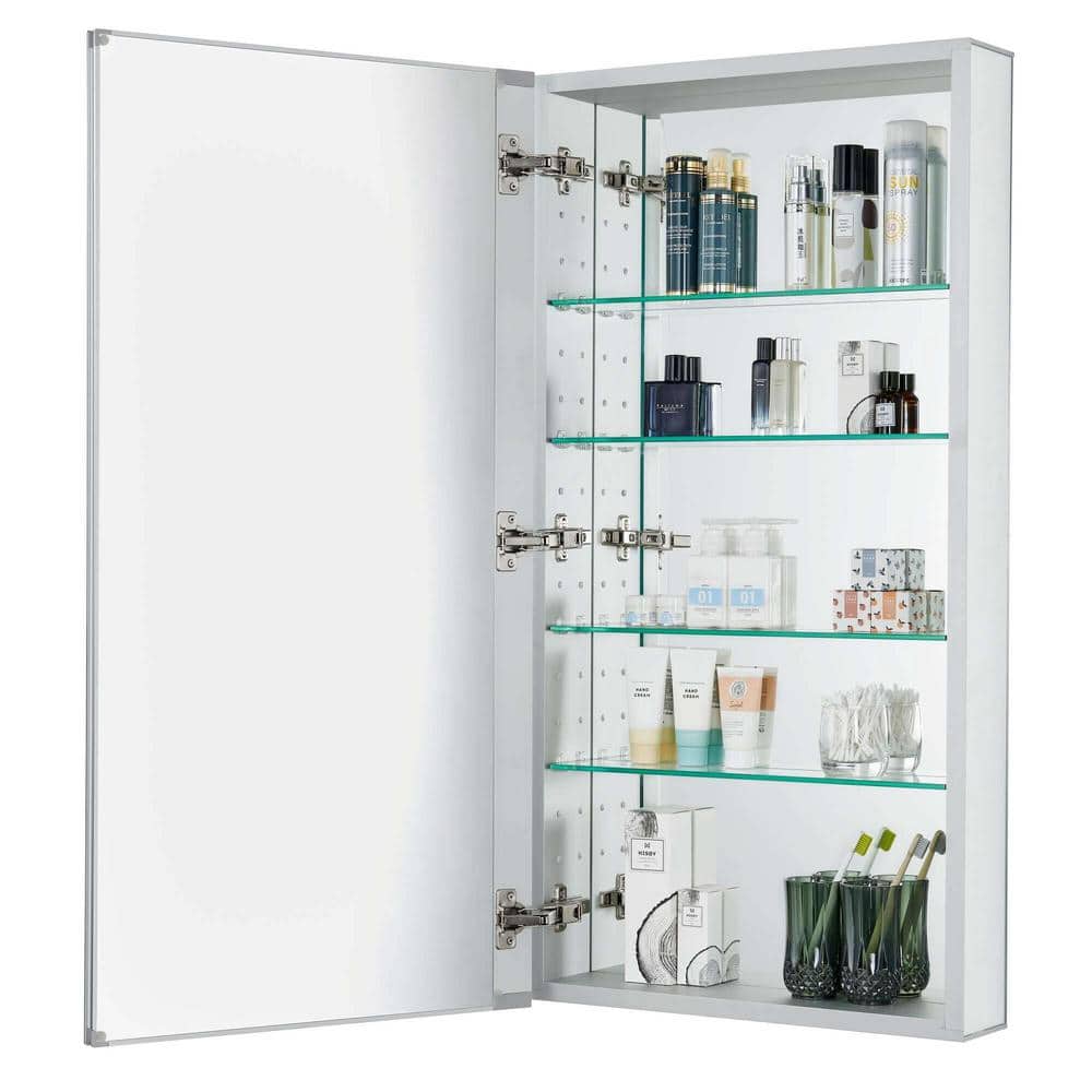 Elevate your bathroom aesthetics with the FINE FIXTURES Sleek Silver Medicine Cabinet. Designed with durable anodized aluminum and a frameless mirrored design, this cabinet offers both style and functionality, featuring adjustable tempered glass shelves to meet your storage needs.